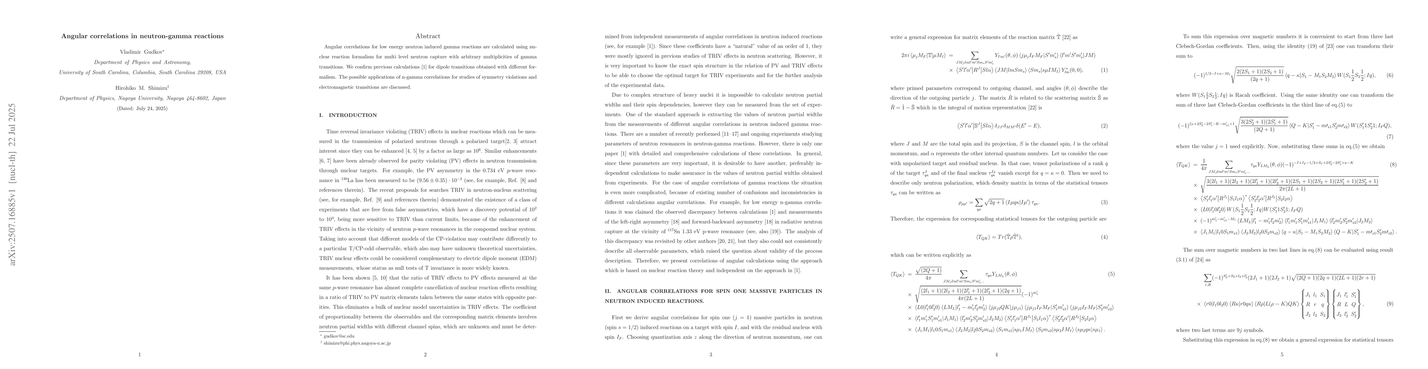 Angular correlations for low energy neutron induced gamma reactions are calculated using nuclear reaction formalism for multi level neutron capture with arbitrary multiplicities of gamma transitions. We confirm previous calculations [1] for dipole transitions obtained with different formalism. The possible applications of n-gamma correlations for studies of symmetry violations and electromagnetic transitions are discussed.
