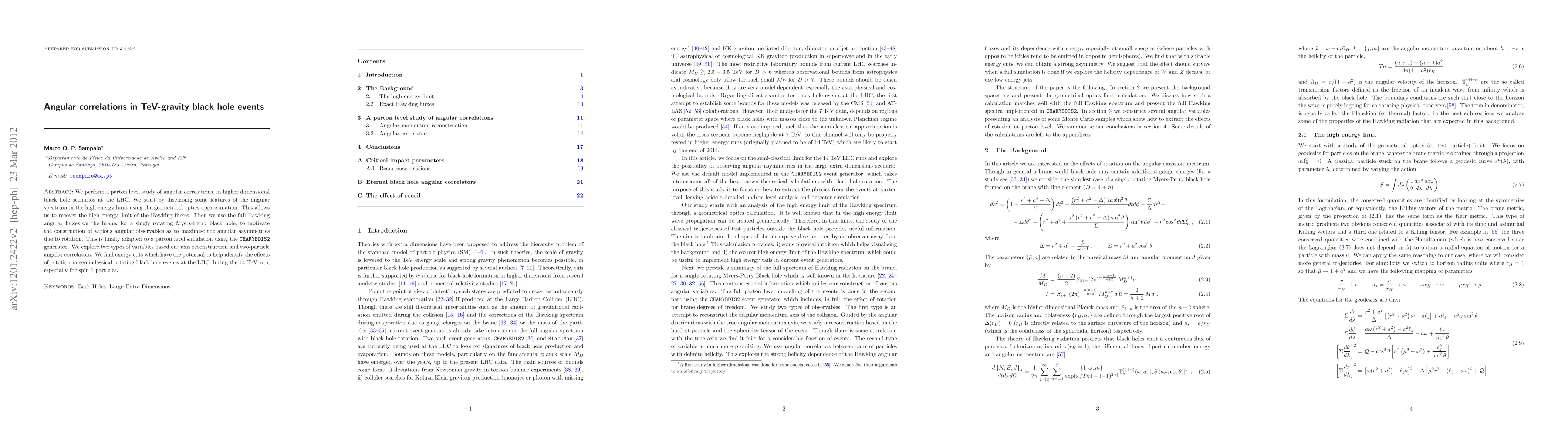 We perform a parton level study of angular correlations, in higher dimensional black hole events scenarios at the LHC. We start by discussing some features of the angular spectrum in the high energy limit using the geometrical optics approximation. This allows us to recover the high energy limit of the Hawking fluxes. Then we use the full Hawking angular fluxes on the brane, for a singly rotating Myers-Perry black hole, to motivate the construction of various angular observables as to maximise the angular asymmetries due to rotation. This is finally adapted to a parton level simulation using the CHARYBDIS2 generator. We explore two types of variables based on: axis reconstruction and two-particle angular correlators. We find energy cuts which have the potential to help identify the effects of rotation in semi-classical rotating black hole events at the LHC during the 14 TeV run, especially for spin-1 particles.