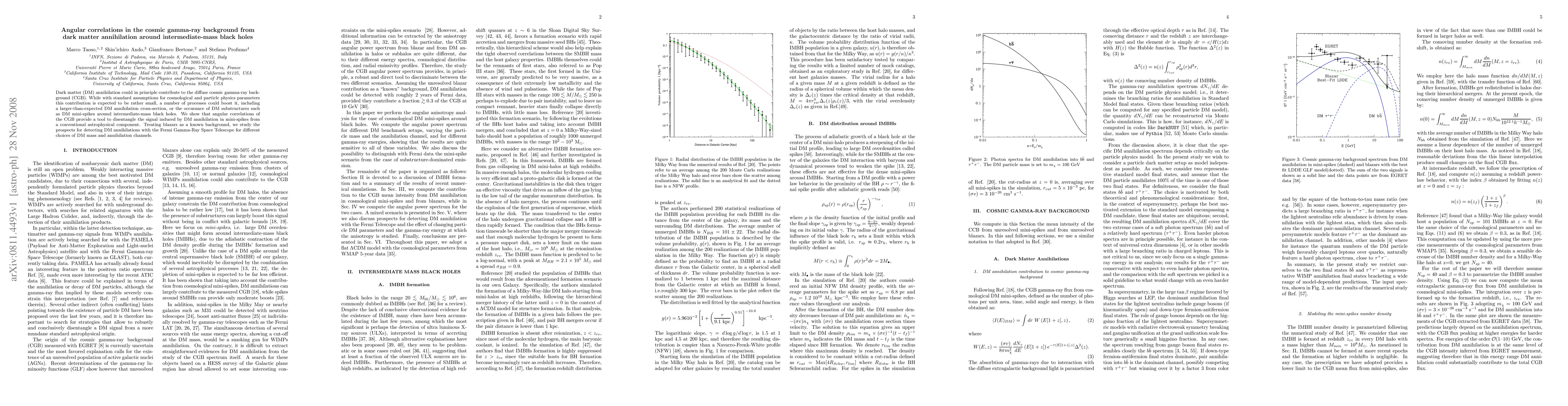 Dark matter (DM) annihilation could in principle contribute to the diffuse cosmic gamma-ray back- ground (CGB). While with standard assumptions for cosmological and particle physics parameters this contribution is expected to be rather small, a number of processes could boost it, including a larger-than-expected DM annihilation cross-section, or the occurance of DM substructures such as DM mini-spikes around intermediate-mass black holes. We show that angular correlations of the CGB provide a tool to disentangle the signal induced by DM annihilation in mini-spikes from a conventional astrophysical component. Treating blazars as a known background, we study the prospects for detecting DM annihilations with the Fermi Gamma-Ray Space Telescope for different choices of DM mass and annihilation channels.