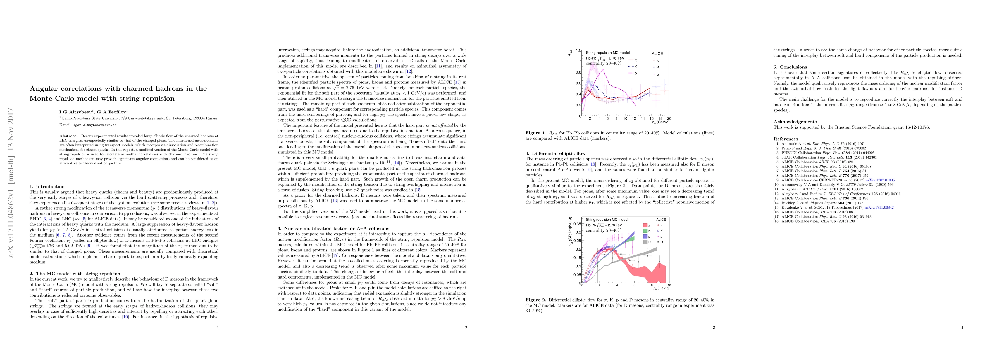 This paper investigates angular correlations in charmed hadrons using a modified Monte Carlo model with string repulsion, finding significant correlations that suggest an alternative to the thermalization picture, mirroring the elliptic flow observed in charged pions.