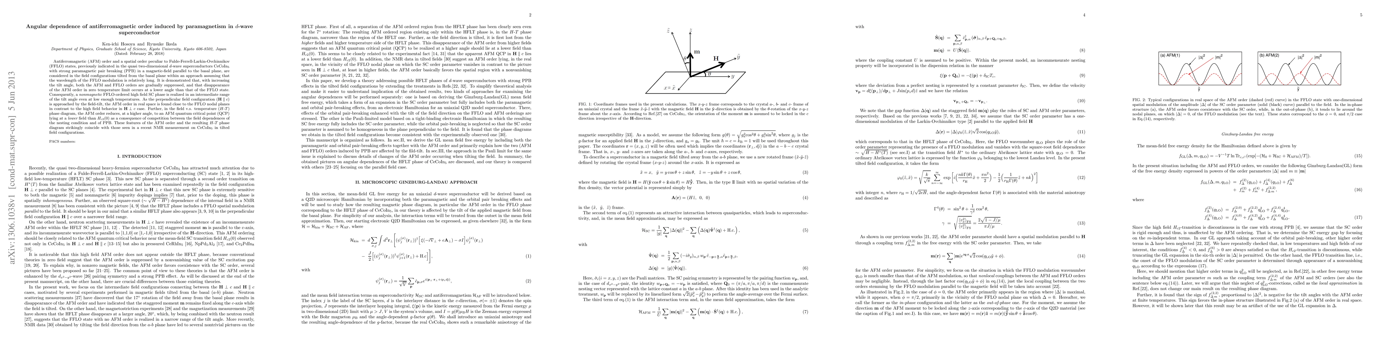 Antiferromagnetic (AFM) order and a spatial order peculiar to Fulde-Ferrell-Larkin-Ovchinnikov (FFLO) states, previously indicated in the quasi two-dimensional d-wave superconductors CeCoIn_5 with strong paramagnetic pair breaking (PPB) in a magnetic-field parallel to the basal plane, are considered in the field configurations tilted from the basal plane within an approach assuming that the wavelength of the FFLO modulation is relatively long. It is demonstrated that, with increasing the tilt angle, both the AFM and FFLO orders are gradually suppressed, and that disappearance of the AFM order in zero temperature limit occurs at a lower angle than that of the FFLO state. Consequently, a nonmagnetic FFLO-ordered high field SC phase is realized in an intermediate range of the tilt angle even at low enough temperatures. As the perpendicular field configuration (${\bf H} \parallel c$) is approached by the field-tilt, the AFM order in real space is found close to the FFLO nodal planes in contrast to the high field behavior in ${\bf H} \perp c$ case. Further, in the field v.s. temperature (H-T) phase diagram, the AFM order reduces, at a higher angle, to an AFM quantum critical point (QCP) lying at a lower field than H_{c2}(0) as a consequence of competition between the field dependences of the nesting condition and of PPB. These features of the AFM order and the resulting H-T phase diagram strikingly coincide with those seen in a recent NMR measurement on CeCoIn_5 in tilted field configurations.