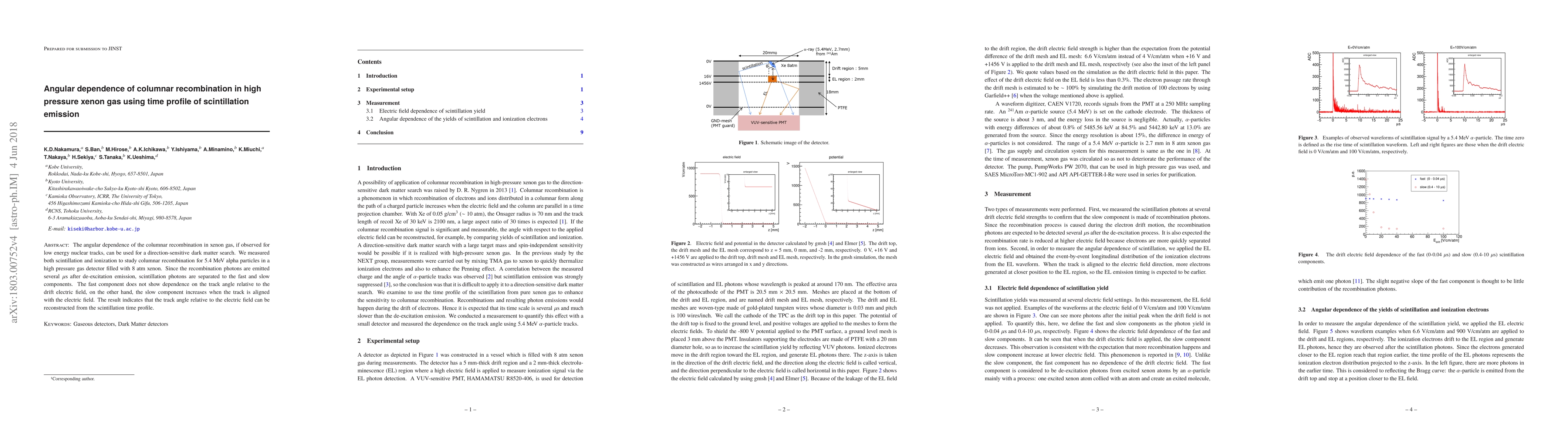 This study investigates the angular dependence of columnar recombination in high pressure xenon gas using the time profile of scintillation emission for 5.4 MeV alpha particles. The slow component of scintillation photons increases when the particle's track aligns with the electric field, indicating potential for direction-sensitive dark matter detection.