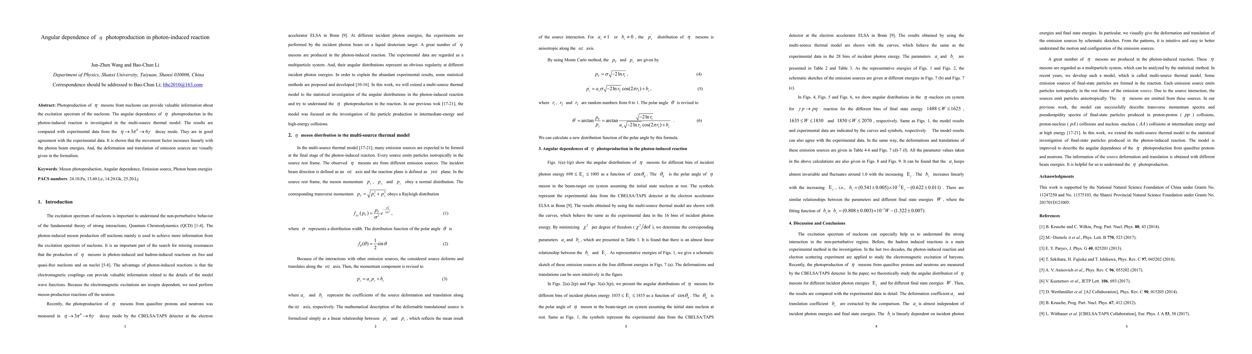 This study investigates the angular dependence of eta meson photoproduction from nucleons using a multi-source thermal model, showing good agreement with experimental data. The research reveals a linear increase in the movement factor with photon beam energies and visually demonstrates deformation and translation of emission sources.