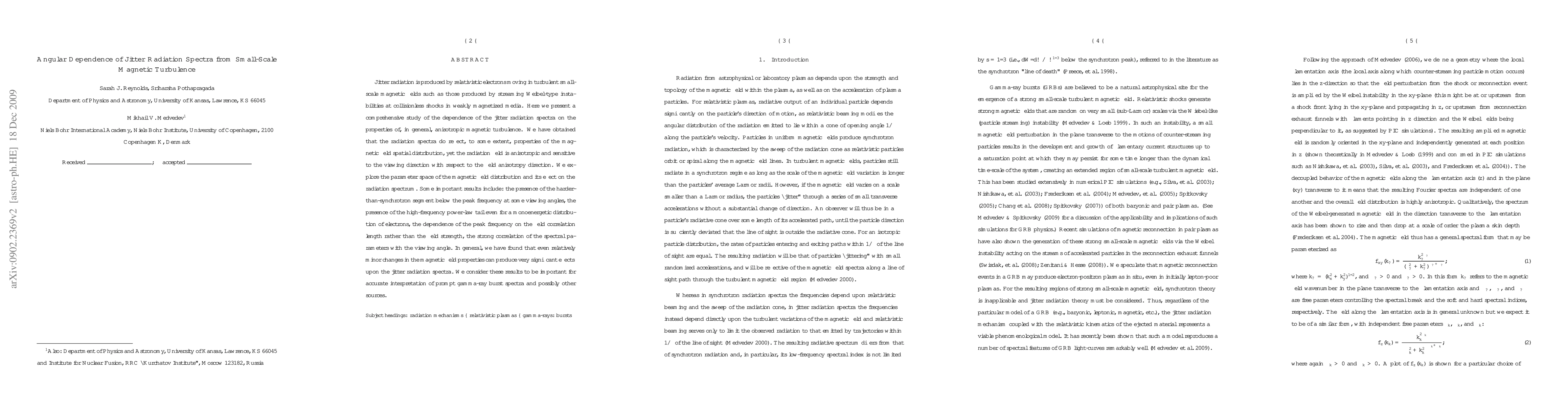 This paper investigates the angular dependence of jitter radiation spectra from small-scale magnetic turbulence, revealing that the radiation is anisotropic and sensitive to the viewing direction relative to the field's anisotropy. Key findings include the presence of a harder-than-synchrotron segment and a high-frequency power-law tail, with significant spectral variations depending on the magnetic field's correlation length and viewing angle.