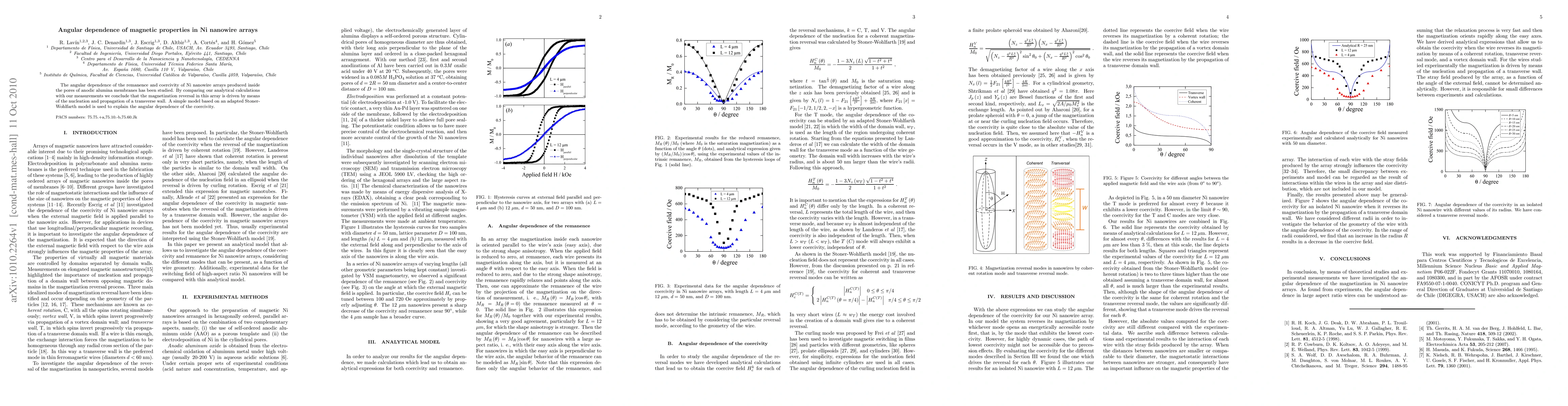 This study investigates the angular dependence of remanence and coercivity in Ni nanowire arrays within anodic alumina membranes, revealing that magnetization reversal is driven by transverse wall nucleation and propagation. The findings are explained using an adapted Stoner-Wohlfarth model.
