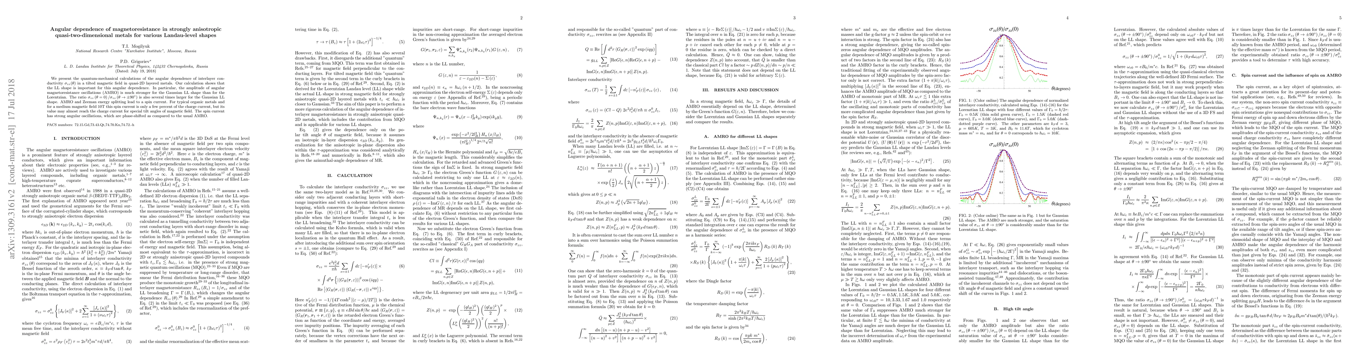 This paper investigates quantum-mechanical calculations of interlayer conductivity in quasi-two-dimensional metals under a tilted magnetic field, revealing that the shape of Landau levels significantly affects angular magnetoresistance oscillations. The Gaussian Landau level shape results in much stronger angular magnetoresistance and spin current compared to the Lorentzian shape.