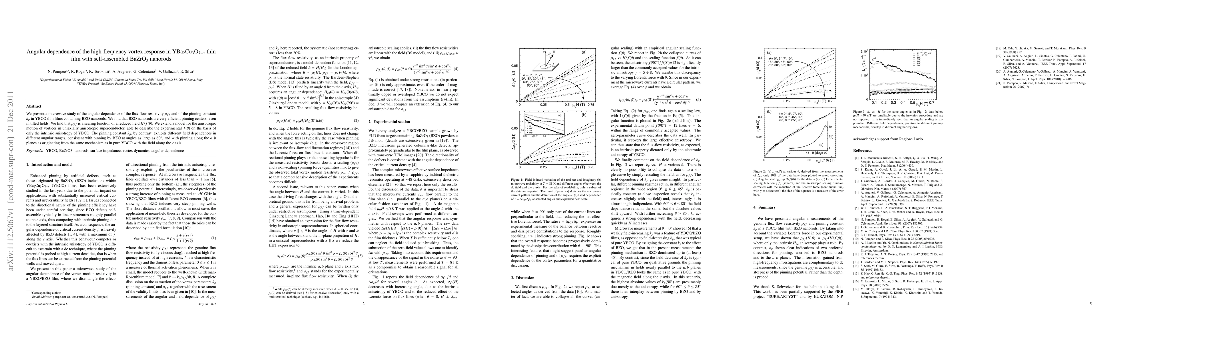 We present a microwave study of the angular dependence of the flux-flow resistivity $\rho_{ff}$ and of the pinning constant $k_p$ in YBCO thin films containing BZO nanorods. We find that BZO nanorods are very efficient pinning centers, even in tilted fields. We find that $\rho_{ff}$ is a scaling function of a reduced field $H/f(\theta)$. We extend a model for the anisotropic motion of vortices in uniaxially anisotropic superconductor, able to describe the experimental $f(\theta)$ on the basis of only the intrinsic anisotropy of YBCO. The pinning constant $k_p$, by contrast, exhibits different field dependences in different angular ranges, consistent with pinning by BZO at angles as large as 60$^{\circ}$, and with pinning along the $a,b$ planes as originating from the same mechanism as in pure YBCO with the field along the c axis.