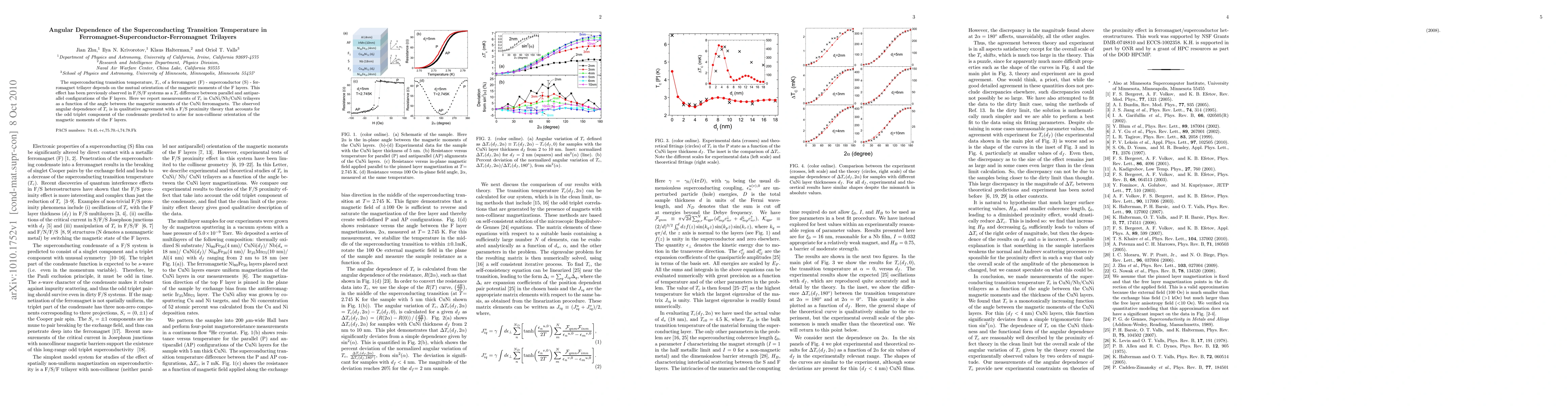 This study investigates the angular dependence of the superconducting transition temperature ($T_c$) in CuNi/Nb/CuNi trilayers, finding that $T_c$ varies with the angle between the CuNi ferromagnet layers' magnetic moments. The results support a theoretical model predicting an odd triplet component in the superconducting condensate for non-collinear magnetic orientations.
