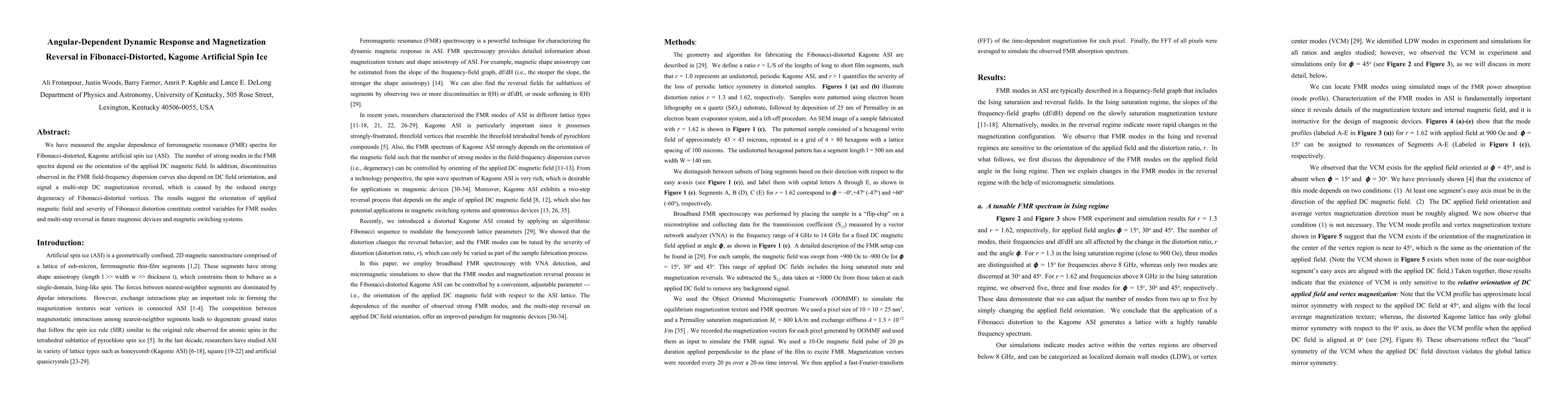 We have measured the angular dependence of ferromagnetic resonance (FMR) spectra for Fibonacci-distorted, Kagome artificial spin ice (ASI). The number of strong modes in the FMR spectra depend on the orientation of the applied DC magnetic field. In addition, discontinuities observed in the FMR field-frequency dispersion curves also depend on DC field orientation, and signal a multi-step DC magnetization reversal, which is caused by the reduced energy degeneracy of Fibonacci-distorted vertices. The results suggest the orientation of applied magnetic field and severity of Fibonacci distortion constitute control variables for FMR modes and multi-step reversal in future magnonic devices and magnetic switching systems.