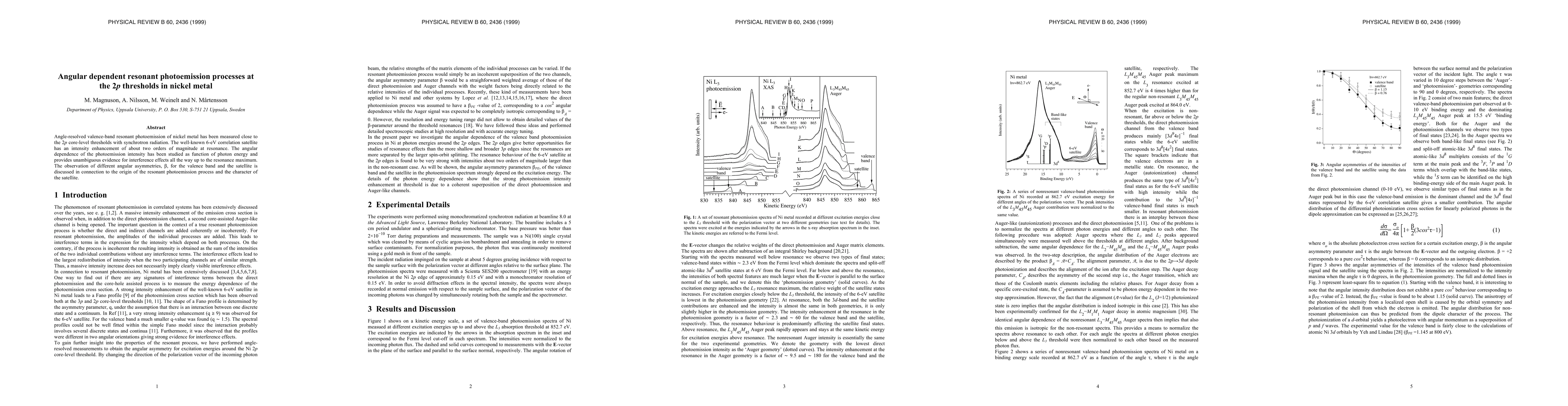 This study investigates angle-resolved valence-band resonant photoemission in nickel metal near the 2p core-level thresholds, revealing significant intensity enhancement of the 6-eV satellite at resonance. The research provides clear evidence of interference effects and distinct angular asymmetries for the valence band and satellite, shedding light on the resonant photoemission process.