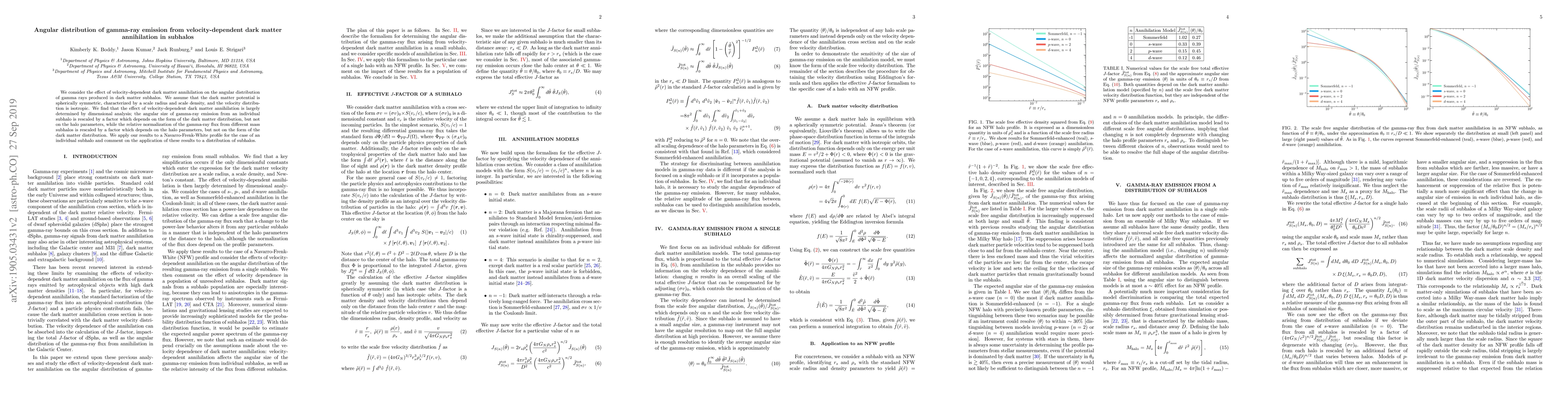 This paper examines the angular distribution of gamma rays from velocity-dependent dark matter annihilation in subhalos. It finds that the angular size of gamma-ray emission is rescaled by a factor dependent on the dark matter distribution, while the relative normalization of gamma-ray flux from different subhalos depends on the subhalo parameters.
