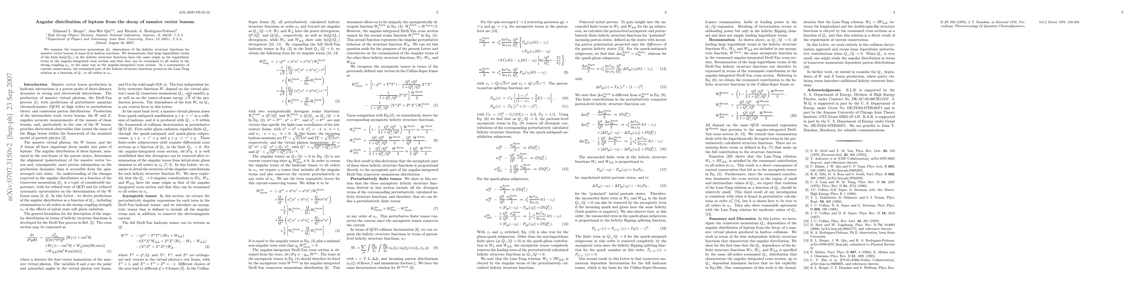 We examine the transverse momentum $Q_\perp$ dependence of the helicity structure functions for massive vector bosons of mass $Q$ in hadron reactions. We demonstrate that large logarithmic terms of the form $\ln(Q/Q_\perp)$ in the helicity structure functions have the same origin as the logarithmic terms in the angular-integrated cross section and that they can be resummed to all orders in the strong coupling $\alpha_s$, in the same way as the angular-integrated cross section. As a consequence of current conservation, the resummed part of the helicity structure functions preserves the Lam-Tung relation as a function of $Q_\perp$ to all orders in $\alpha_s$.