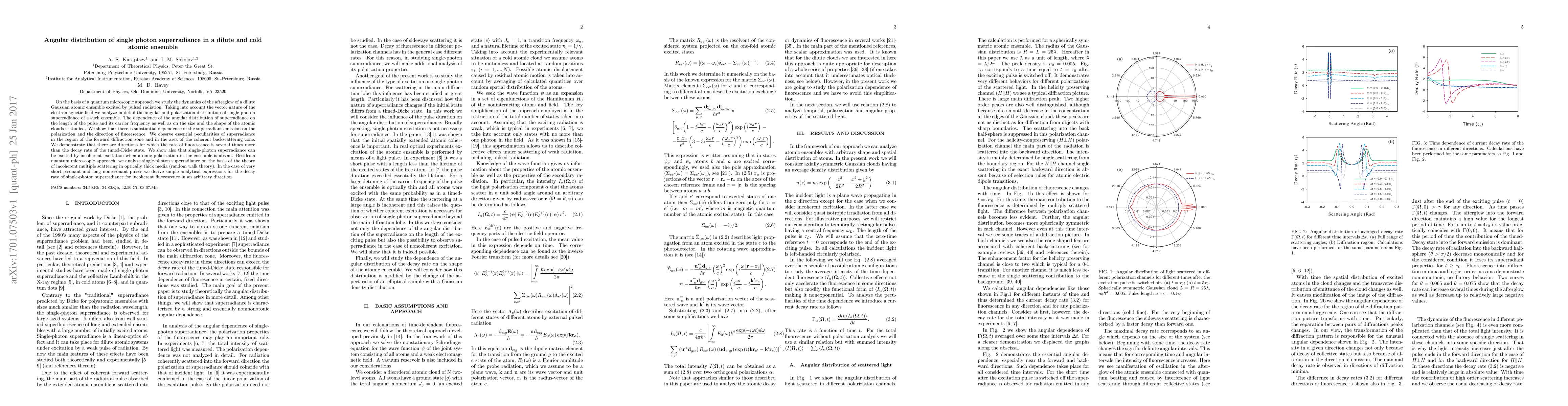 This paper explores the angular distribution of single-photon superradiance in a dilute, cold atomic ensemble using quantum microscopic and incoherent scattering theories. It reveals significant dependencies on pulse length, carrier frequency, and atomic cloud characteristics, highlighting enhanced fluorescence rates and unique behaviors in specific angular regions.