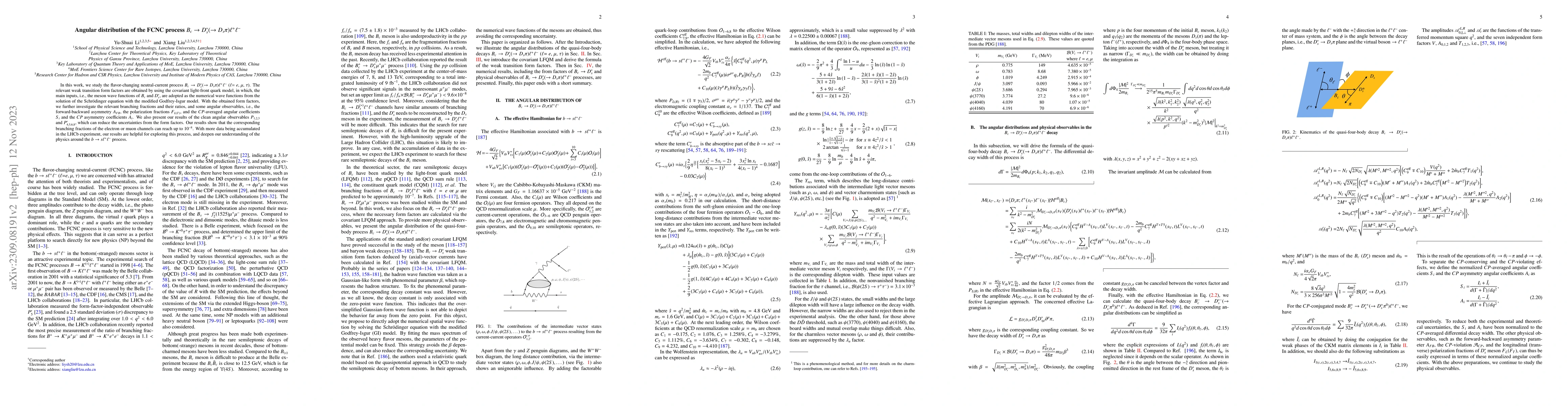 This paper investigates the angular distribution of the flavor-changing neutral-current process $B_{c}\to{D}_{s}^{*}(\to{D}_{s}\pi)\ell^{+}\ell^{-}$ using the covariant light-front quark model. It calculates branching fractions and angular observables, including $A_{FB}$, $F_{L(T)}$, and $CP$ asymmetries, to deepen understanding of the $b\to{s}\ell^{+}\ell^{-}$ process.