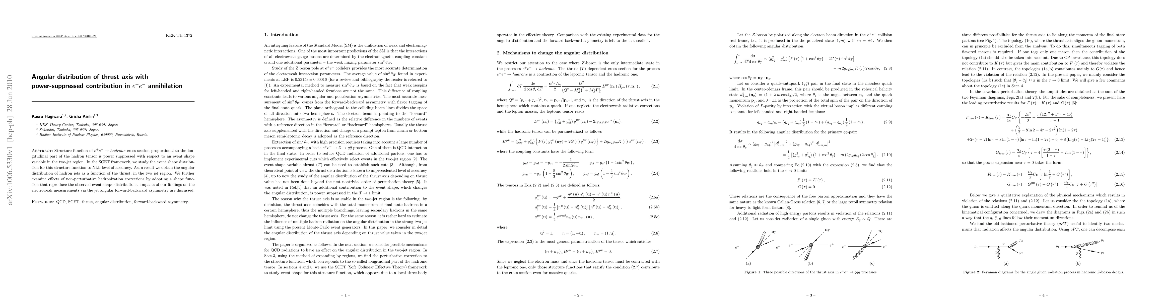 This paper investigates the angular distribution of thrust axis in e+e- annihilation, focusing on the structure function's power-suppressed contribution in the two-jet region. Using the SCET framework, it achieves NLL accuracy and examines non-perturbative corrections, ultimately discussing implications for electroweak measurements through jet angular asymmetry.