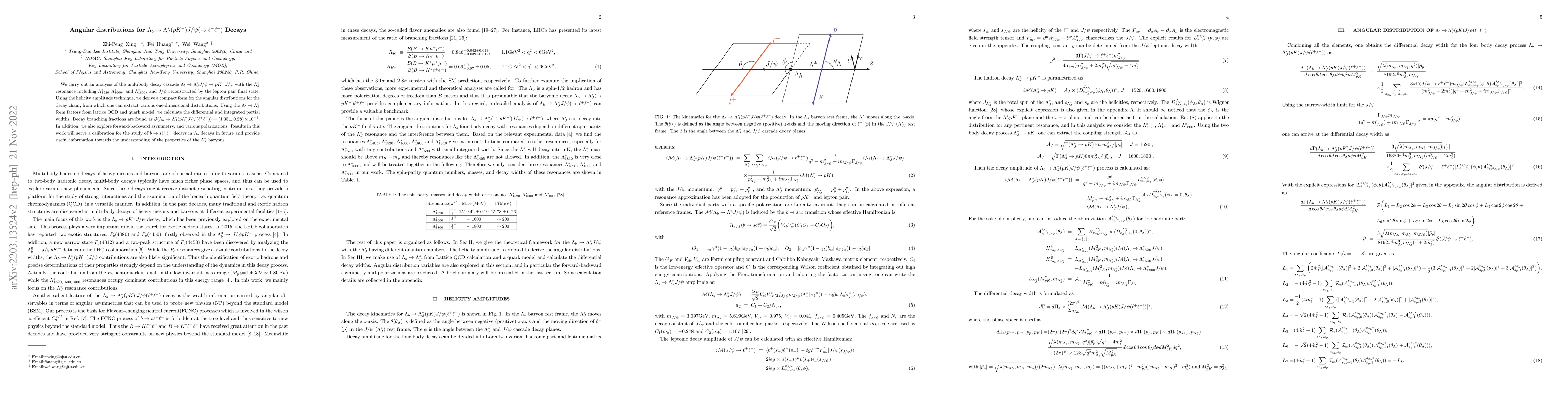 This paper analyzes the multibody decay cascade $\Lambda_b\to \Lambda^*_J (pK^-)J/\psi$ using the helicity amplitude technique to derive angular distributions. It calculates differential and integrated partial widths, finding a branching fraction of $(1.35\pm0.28)\times 10^{-5}$, and explores forward-backward asymmetry and polarizations, providing insights for future studies of $b\to s \ell^+\ell^-$ decays.