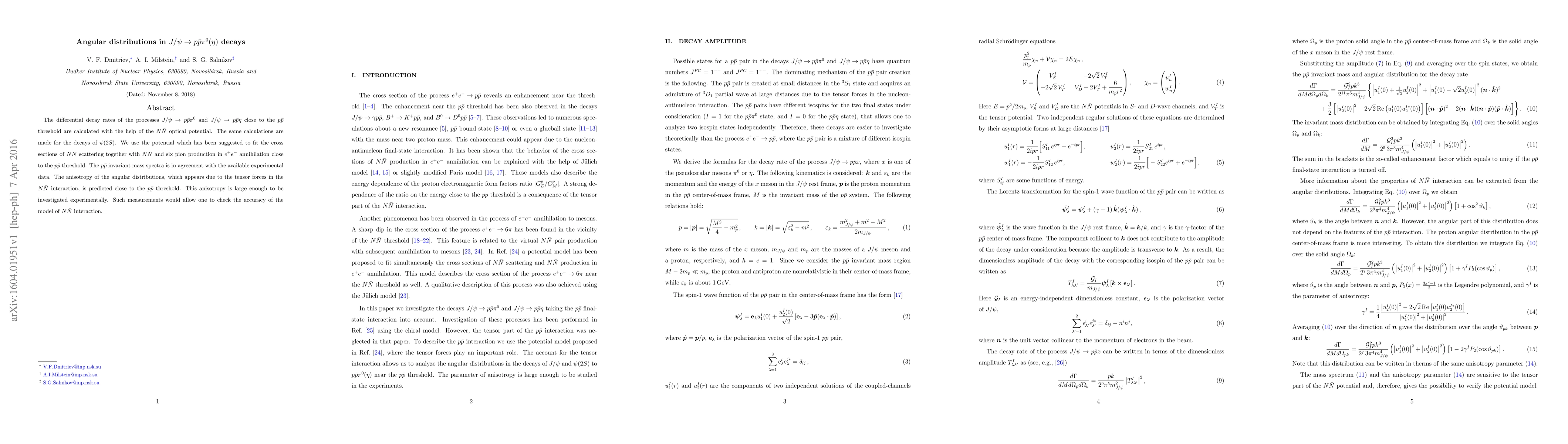 Researchers calculated differential decay rates for $J/ heta o par{p} ho^0$ and $ o par{p} ho^0$ decays near the proton-antiproton threshold using the Nar{N} optical potential, predicting anisotropy due to tensor forces that could be experimentally verified.