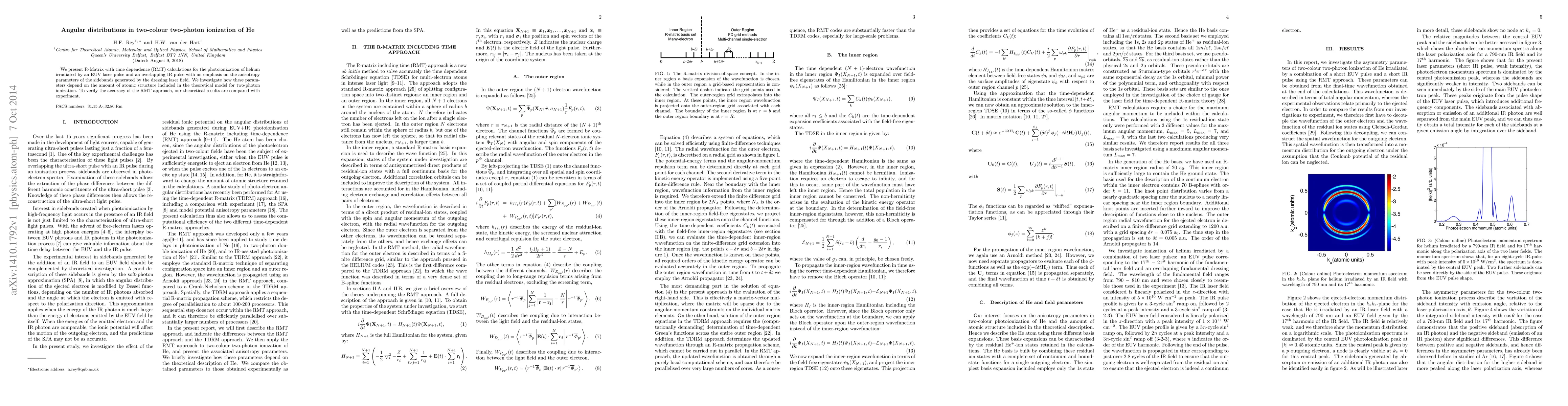 This paper uses R-Matrix with time dependence calculations to study the angular distributions in two-colour two-photon ionization of helium, focusing on the anisotropy parameters of sidebands generated by an IR pulse. The study compares theoretical models' accuracy with experimental data to understand the dependence of these parameters on atomic structure details.