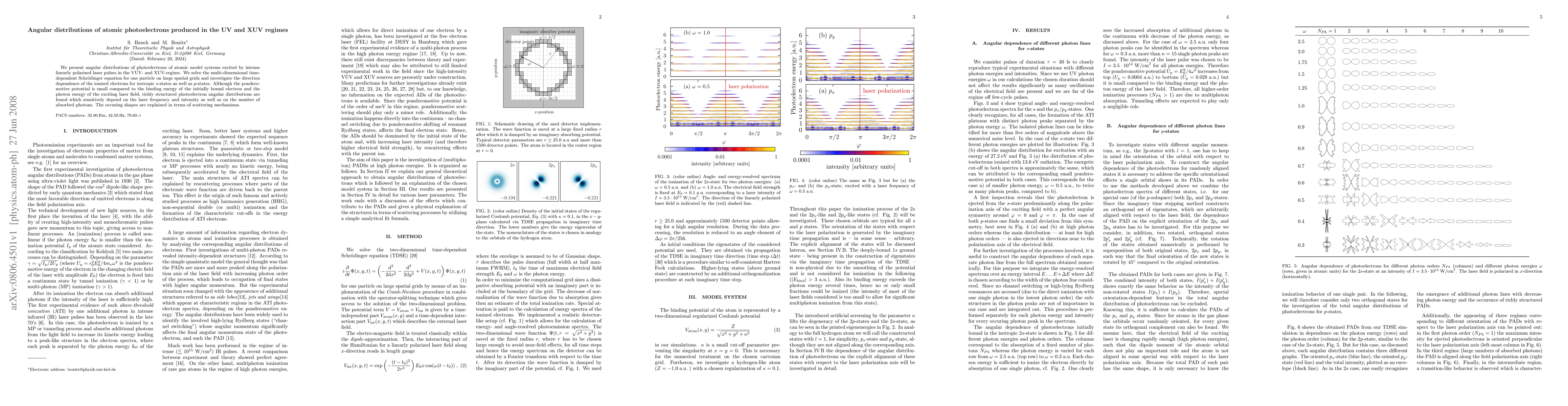 We present angular distributions of photoelectrons of atomic model systems excited by intense linearly polarized laser pulses in the VUV- and XUV-regime. We solve the multi-dimensional time-dependent Schr\"odinger equation for one particle on large spatial grids and investigate the direction dependence of the ionized electrons for isotropic s-states as well as p-states. Although the ponderomotive potential is small compared to the binding energy of the initially bound electron and the photon energy of the exciting laser field, richly structured photoelectron angular distributions are found which sensitively depend on the laser frequency and intensity as well as on the number of absorbed photons. The occuring shapes are explained in terms of scattering mechanisms.