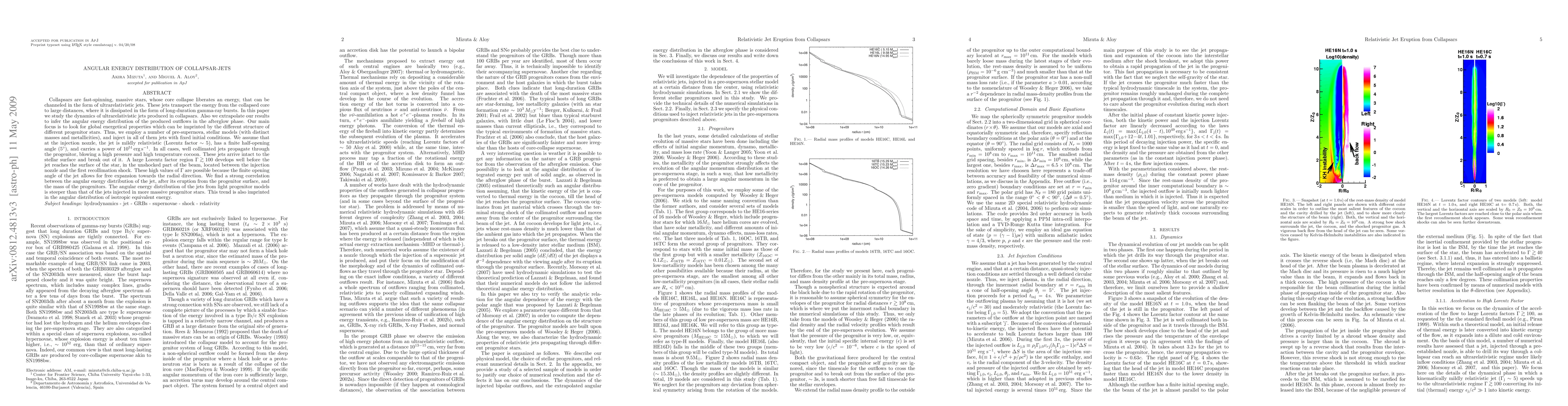 Collapsars are fast-spinning, massive stars, whose core collapse liberates an energy, that can be channeled in the form of ultrarelativistic jets. These jets transport the energy from the collapsed core to large distances, where it is dissipated in the form of long-duration gamma-ray bursts. In this paper we study the dynamics of ultrarelativistic jets produced in collapsars. Also we extrapolate our results to infer the angular energy distribution of the produced outflows in the afterglow phase. Our main focus is to look for global energetical properties which can be imprinted by the different structure of different progenitor stars. Thus, we employ a number of pre-supernova, stellar models (with distinct masses and metallicities), and inject in all of them jets with fixed initial conditions. We assume that at the injection nozzle, the jet is mildly relativistic (Lorentz factor $\sim 5$), has a finite half-opening angle ($5^\circ$), and carries a power of $10^{51} $erg s$^{-1}$. These jets arrive intact to the stellar surface and break out of it. A large Lorentz factor region $\Gamma\simmore 100$ develops well before the jet reaches the surface of the star, in the unshocked part of the beam, located between the injection nozzle and the first recollimation shock. These high values of $\Gamma$ are possible because the finite opening angle of the jet allows for free expansion towards the radial direction. We find a strong correlation between the angular energy distribution of the jet, after its eruption from the progenitor surface, and the mass of the progenitors. The angular energy distribution of the jets from light progenitor models is steeper than that of the jets injected in more massive progenitor stars. This trend is also imprinted in the angular distribution of isotropic equivalent energy.