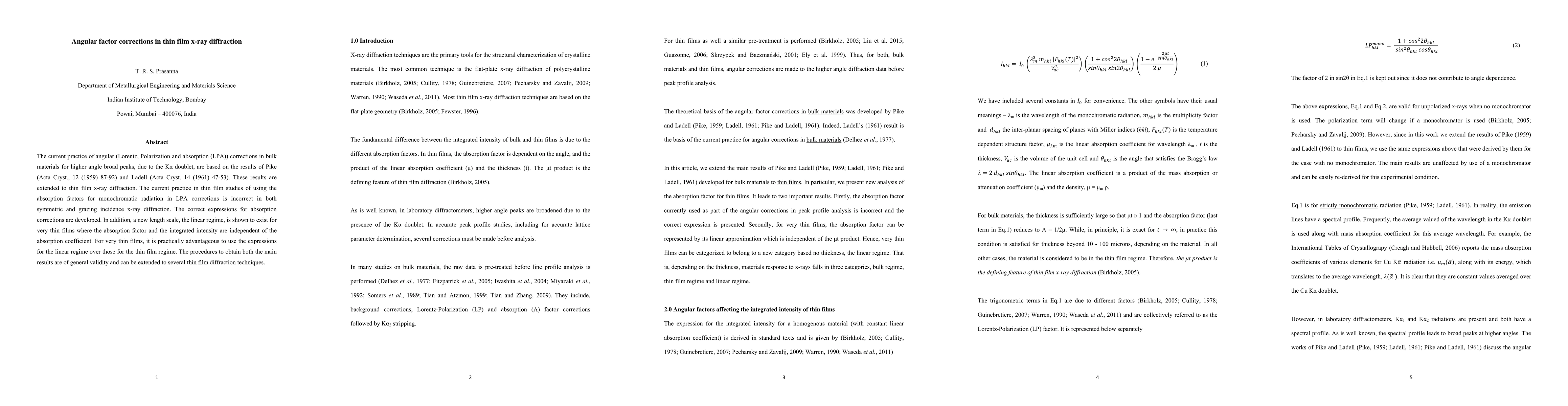 This paper extends angular corrections for Lorentz, Polarization, and absorption (LPA) factors from bulk materials to thin film x-ray diffraction, correcting the current practice for absorption factors. It introduces a new linear regime for very thin films where absorption factors and integrated intensity are independent of the absorption coefficient, offering practical advantages for such films.