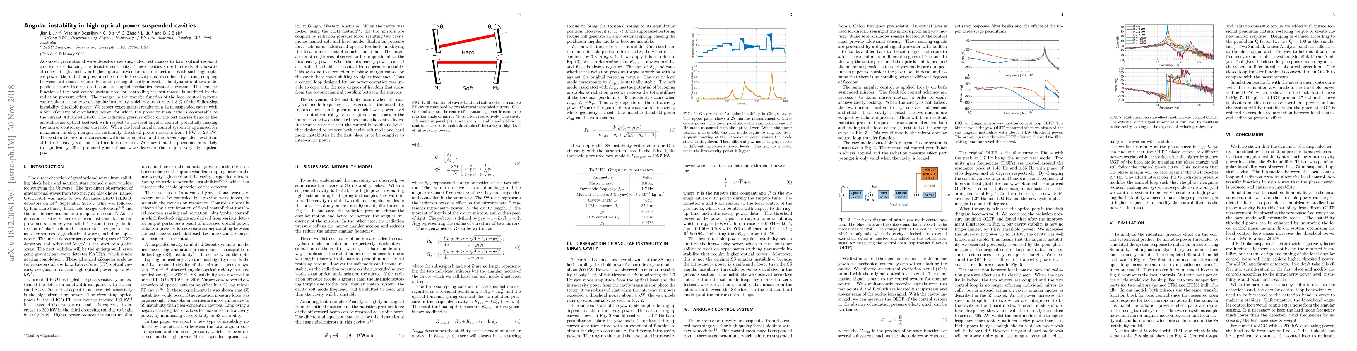 Advanced gravitational wave detectors use suspended test masses to form optical resonant cavities for enhancing the detector sensitivity. These cavities store hundreds of kilowatts of coherent light and even higher optical power for future detectors. With such high optical power, the radiation pressure effect inside the cavity creates sufficiently strong coupling between test masses whose dynamics are significantly altered. The dynamics of two independent nearly free masses become a coupled mechanical resonator system. The transfer function of the local control system used for controlling the test masses is modified by the radiation pressure effect. The changes in the transfer function of the local control systems can result in a new type of angular instability which occurs at only 1.3 \% of the Sidles-Sigg instability threshold power. We report experimental results on a 74~m suspended cavity with a few kilowatts of circulating power, for which the power to mass ratio is comparable to the current Advanced LIGO. The radiation pressure effect on the test masses behaves like an additional optical feedback with respect to the local angular control, potentially making the mirror control system unstable. When the local angular control system is optimized for maximum stability margin, the instability threshold power increases from 4~kW to 29~kW. The system behavior is consistent with our simulation and the power dependent evolution of both the cavity soft and hard mode is observed. We show that this phenomenon is likely to significantly affect proposed gravitational wave detectors that require very high optical power.