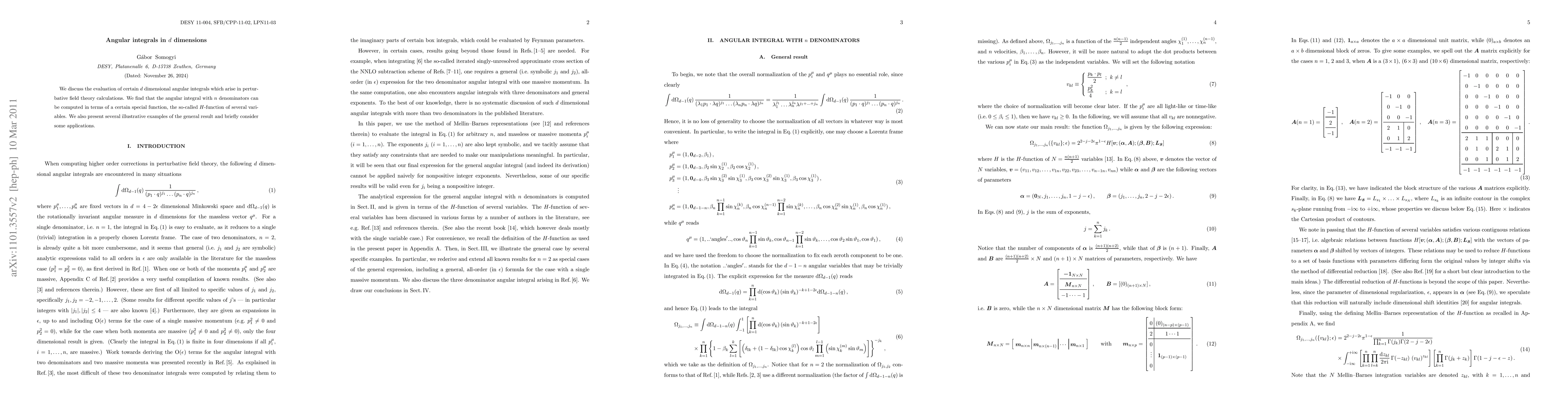 We discuss the evaluation of certain d dimensional angular integrals which arise in perturbative field theory calculations. We find that the angular integral with n denominators can be computed in terms of a certain special function, the so-called H-function of several variables. We also present several illustrative examples of the general result and briefly consider some applications.
