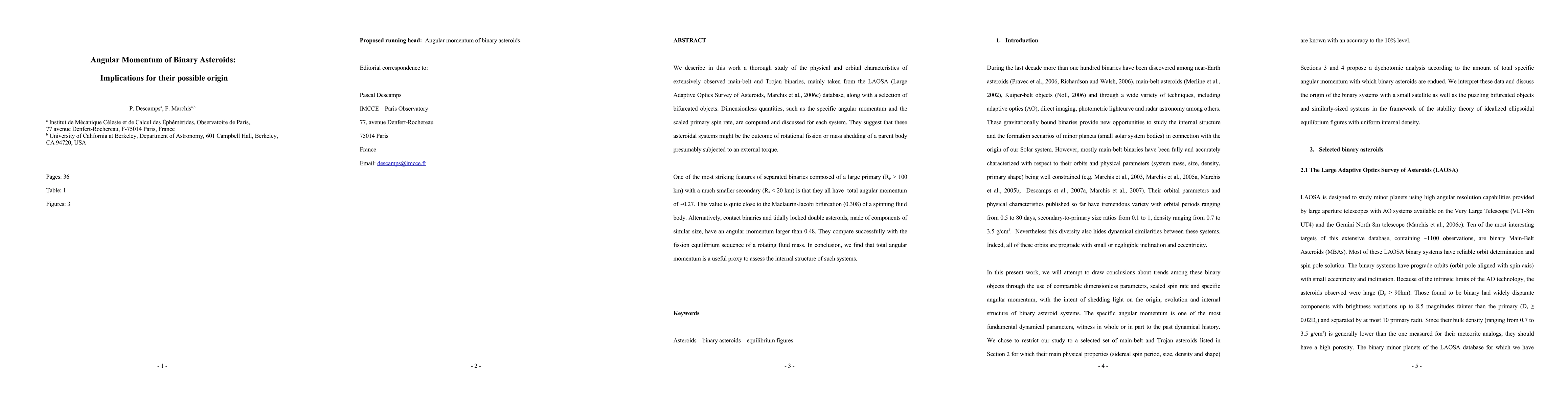 We describe in this work a thorough study of the physical and orbital characteristics of extensively observed main-belt and Trojan binaries, mainly taken from the LAOSA (Large Adaptive Optics Survey of Asteroids, Marchis et al., 2006c) database, along with a selection of bifurcated objects. Dimensionless quantities, such as the specific angular momentum and the primary spin rate, are computed and discussed for each system. They suggest that these asteroidal systems might be the outcome of rotational fission or mass shedding of a parent body presumably subjected to an external torque. One of the most striking features of separated binaries composed of a large primary (Rp > 100 km) with a much smaller secondary (Rs < 20 km) is that they all have total angular momentum of 0.27. This value is quite close to the Maclaurin-Jacobi bifurcation (0.308) of a spinning fluid body. Alternatively, contact binaries and tidally locked double asteroids, made of components of similar size, have an angular momentum larger than 0.48. They compare successfully with the fission equilibrium sequence of a rotating fluid mass. In conclusion, we find that total angular momentum is a useful proxy to assess internal structure of such systems.