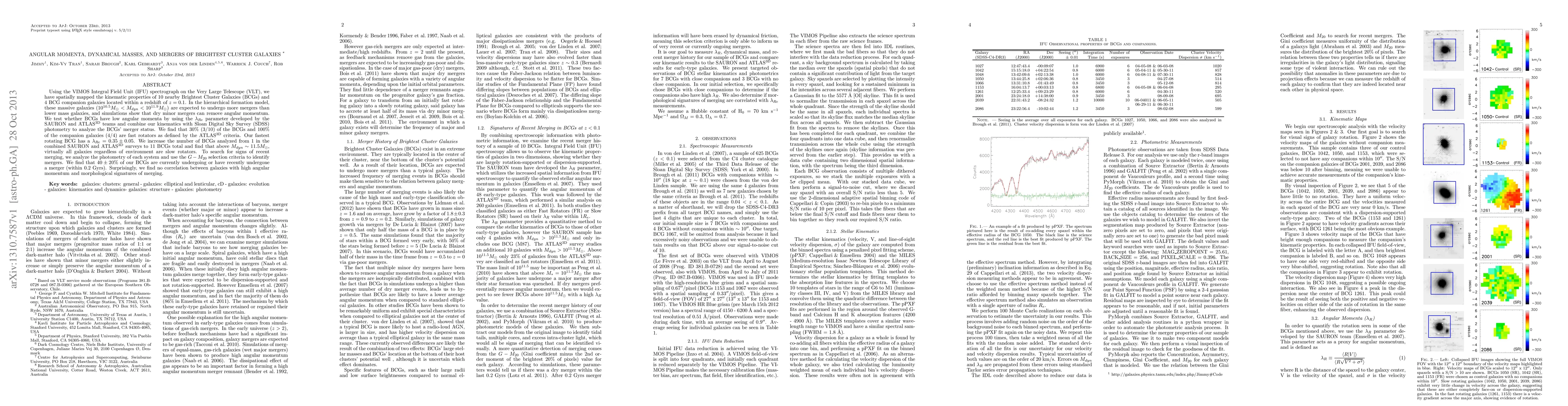 This study uses the VIMOS IFU spectrograph to analyze the kinematic properties of 10 nearby Brightest Cluster Galaxies (BCGs) and 4 companion galaxies, finding that 30% of BCGs and all companions are fast rotators. The research reveals that 40±20% of BCGs have undergone or are undergoing recent mergers, but no correlation exists between high angular momentum and merger signatures.