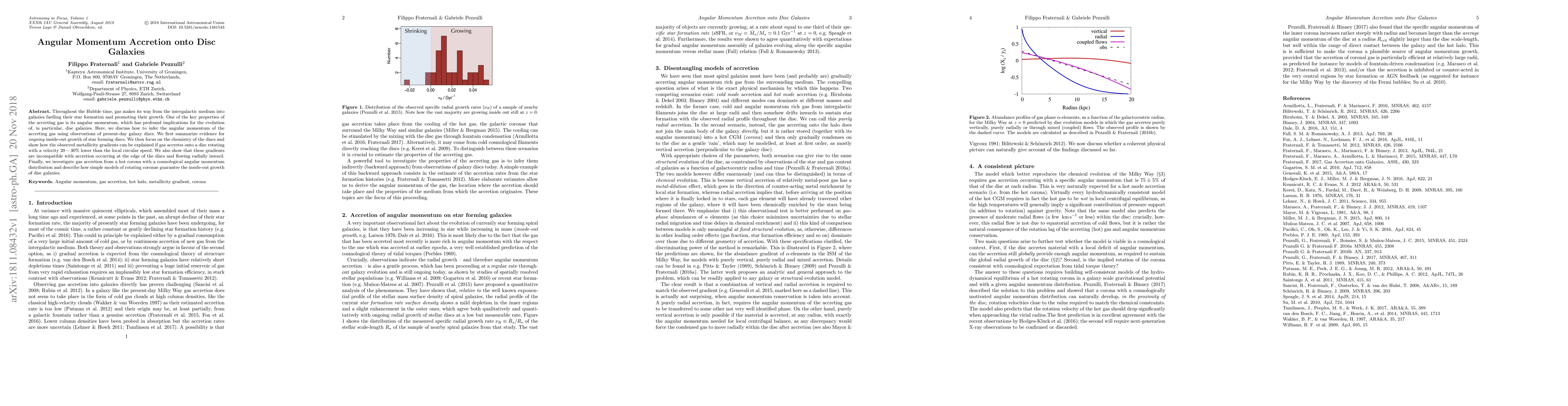 Throughout the Hubble time, gas makes its way from the intergalactic medium into galaxies fuelling their star formation and promoting their growth. One of the key properties of the accreting gas is its angular momentum, which has profound implications for the evolution of, in particular, disc galaxies. Here, we discuss how to infer the angular momentum of the accreting gas using observations of present-day galaxy discs. We first summarize evidence for ongoing inside-out growth of star forming discs. We then focus on the chemistry of the discs and show how the observed metallicity gradients can be explained if gas accretes onto a disc rotating with a velocity 20-30% lower than the local circular speed. We also show that these gradients are incompatible with accretion occurring at the edge of the discs and flowing radially inward. Finally, we investigate gas accretion from a hot corona with a cosmological angular momentum distribution and describe how simple models of rotating coronae guarantee the inside-out growth of disc galaxies.