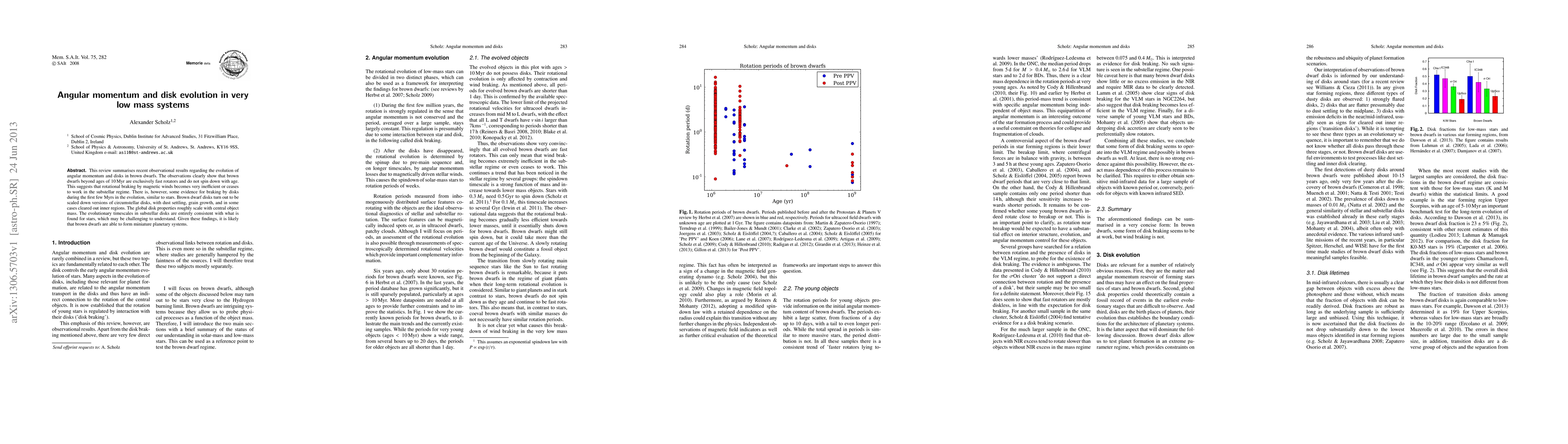 This review summarises recent observational results regarding the evolution of angular momentum and disks in brown dwarfs. The observations clearly show that brown dwarfs beyond ages of 10 Myr are exclusively fast rotators and do not spin down with age. This suggests that rotational braking by magnetic winds becomes very inefficient or ceases to work in the substellar regime. There is, however, some evidence for braking by disks during the first few Myrs in the evolution, similar to stars. Brown dwarf disks turn out to be scaled down versions of circumstellar disks, with dust settling, grain growth, and in some cases cleared out inner regions. The global disk properties roughly scale with central object mass. The evolutionary timescales in substellar disks are entirely consistent with what is found for stars, which may be challenging to understand. Given these findings, it is likely that brown dwarfs are able to form miniature planetary systems.