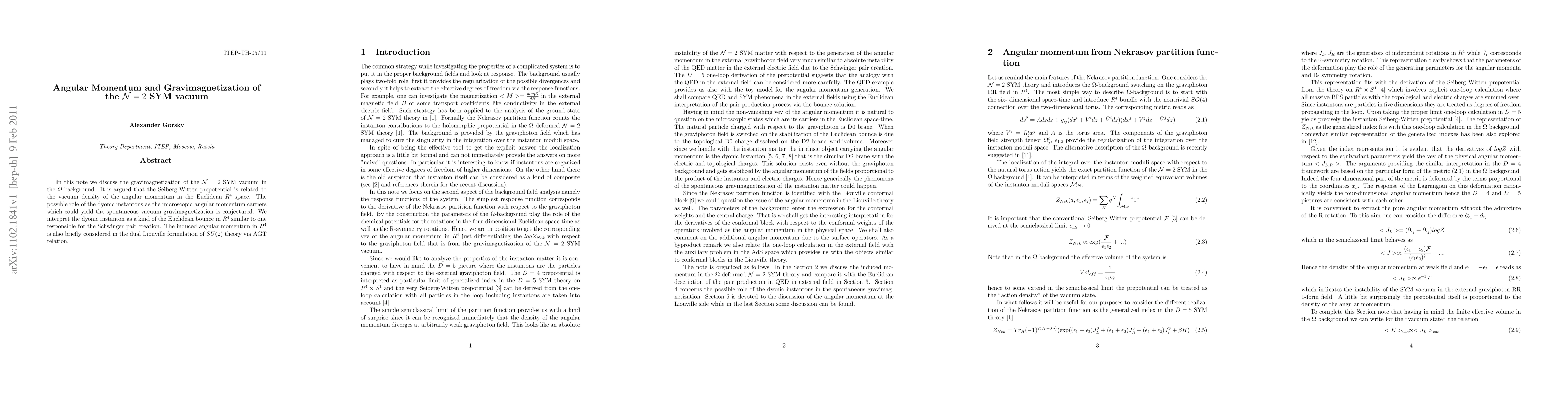 In this note we discuss the gravimagnetization of the ${\cal N}=2$ SYM vacuum in the $\Omega$-background. It is argued that the Seiberg-Witten prepotential is related to the vacuum density of the angular momentum in the Euclidean $R^4$ space. The possible role of the dyonic instantons as the microscopic angular momentum carriers which could yield the spontaneous vacuum gravimagnetization is conjectured. We interpret the dyonic instanton as a kind of the Euclidean bounce in $R^4$ similar to one responsible for the Schwinger pair creation. The induced angular momentum in $R^4$ is also briefly considered in the dual Liouville formulation of $SU(2)$ theory via AGT relation.