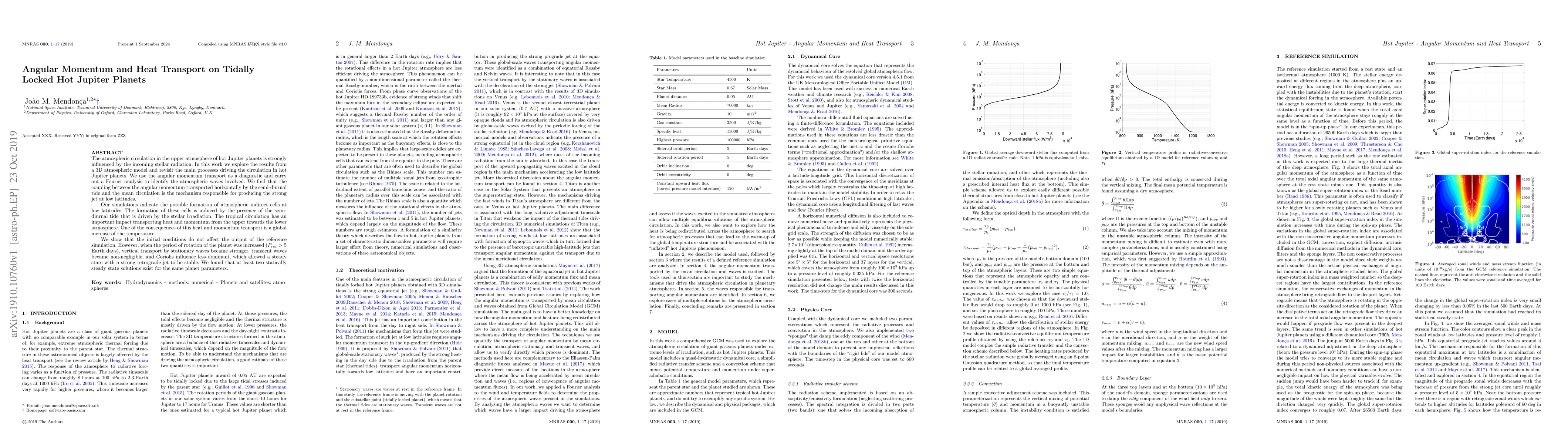 The atmospheric circulation in the upper atmosphere of hot Jupiter planets is strongly influenced by the incoming stellar radiation. In this work we explore the results from a 3D atmospheric model and revisit the main processes driving the circulation in hot Jupiter planets. We use the angular momentum transport as a diagnostic and carry out a Fourier analysis to identify the atmospheric waves involved. We find that the coupling between the angular momentum transported horizontally by the semi-diurnal tide and the mean circulation is the mechanism responsible for producing the strong jet at low latitudes. Our simulations indicate the possible formation of atmospheric indirect cells at low latitudes. The formation of these cells is induced by the presence of the semi-diurnal tide that is driven by the stellar irradiation. The tropical circulation has an important impact transporting heat and momentum from the upper towards the lower atmosphere. One of the consequences of this heat and momentum transport is a global increase of the temperature. We show that the initial conditions do not affect the output of the reference simulation. However, when the period of rotation of the planet was increased ($P_{rot} > 5$ Earth days), vertical transport by stationary waves became stronger, transient waves became non-negligible, and Coriolis influence less dominant, which allowed a steady state with a strong retrograde jet to be stable. We found that at least two statically steady state solutions exist for the same planet parameters.