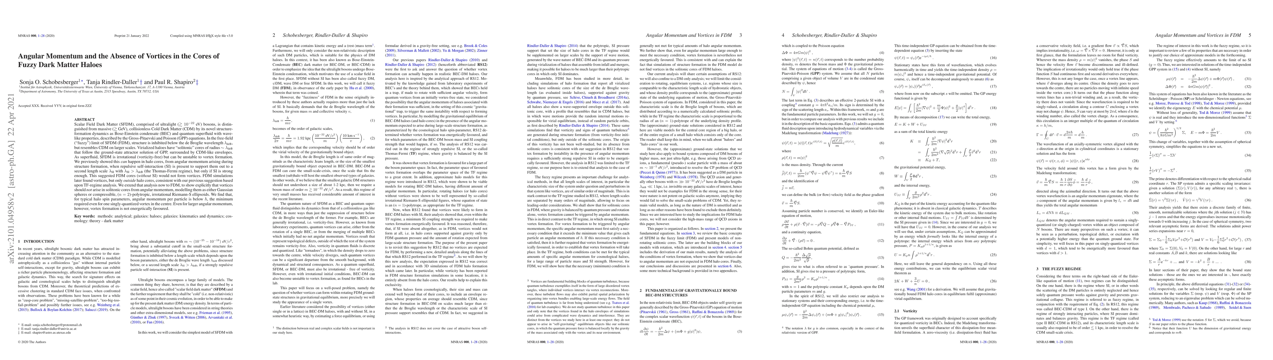 Scalar Field Dark Matter (SFDM), comprised of ultralight ($\gtrsim 10^{-22}$ eV) bosons, is distinguished from massive ($\gtrsim$ GeV), collisionless Cold Dark Matter (CDM) by its novel structure-formation dynamics as Bose-Einstein condensate (BEC) and quantum superfluid with wave-like properties, described by the Gross-Pitaevski and Poisson (GPP) equations. In the free-field (fuzzy) limit of SFDM (FDM), structure is inhibited below the de Broglie wavelength $\lambda_{\text{deB}}$, but resembles CDM on larger scales. Virialized haloes have solitonic cores of radius $\sim \lambda_{\text{deB}}$ that follow the ground-state attractor solution of GPP, surrounded by CDM-like envelopes. As superfluid, SFDM is irrotational (vorticity-free) but can be unstable to vortex formation. We previously showed this can happen in halo cores, from angular momentum arising during structure formation, when repulsive self-interaction (SI) is present to support them out to a second length scale $\lambda_{\text{SI}}$ with $\lambda_{\text{SI}} > \lambda_{\text{deB}}$ (the Thomas-Fermi regime), but only if SI is strong enough. This suggested FDM cores (without SI) would not form vortices. FDM simulations later found vortices, but only outside halo cores, consistent with our previous suggestion based upon TF-regime analysis. We extend that analysis now to FDM, to show explicitly that vortices should not arise in solitonic cores from angular momentum, modelling them as either Gaussian spheres or compressible, ($n = 2$)-polytropic, irrotational Riemann-S ellipsoids. We find that, for typical halo spin parameters, angular momentum per particle is below $\hbar$, the minimum required even for one singly-quantized vortex in the centre. Even for larger angular momentum, however, vortex formation is not energetically favoured.