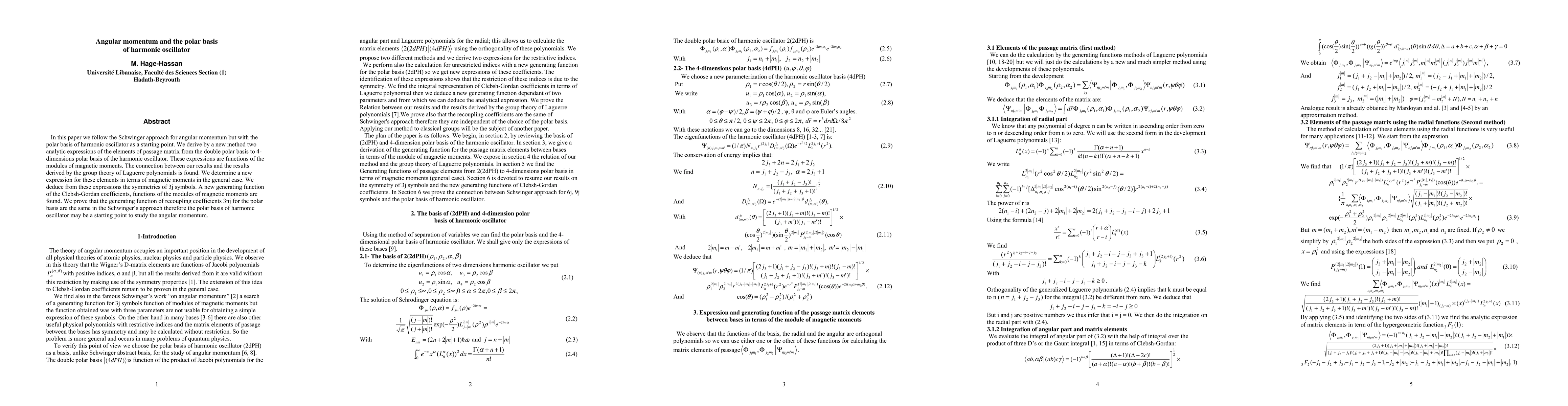 In this paper we follow the Schwinger approach for angular momentum but with the polar basis of harmonic oscillator as a starting point. We derive by a new method two analytic expressions of the elements of passage matrix from the double polar basis to 4- dimensions polar basis of the harmonic oscillator. These expressions are functions of the modules of magnetic moments. The connection between our results and the results derived by the group theory of Laguerre polynomials is found. We determine a new expression for these elements in terms of magnetic moments in the general case. We deduce from these expressions the symmetries of 3j symbols. A new generating function of the Clebsh-Gordan coefficients, functions of the modules of magnetic moments are found. We prove that the generating function of recoupling coefficients 3nj for the polar basis are the same in the Schwinger's approach therefore the polar basis of harmonic oscillator may be a starting point to study the angular momentum.