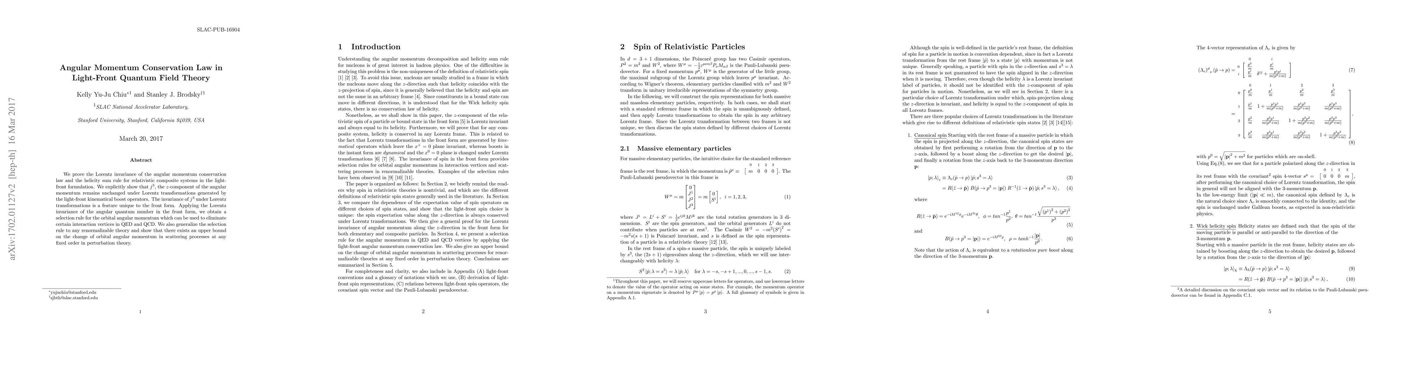 We prove the Lorentz invariance of the angular momentum conservation law and the helicity sum rule for relativistic composite systems in the light-front formulation. We explicitly show that $j^3$, the $z$-component of the angular momentum remains unchanged under Lorentz transformations generated by the light-front kinematical boost operators. The invariance of $j^3$ under Lorentz transformations is a feature unique to the front form. Applying the Lorentz invariance of the angular quantum number in the front form, we obtain a selection rule for the orbital angular momentum which can be used to eliminate certain interaction vertices in QED and QCD. We also generalize the selection rule to any renormalizable theory and show that there exists an upper bound on the change of orbital angular momentum in scattering processes at any fixed order in perturbation theory.