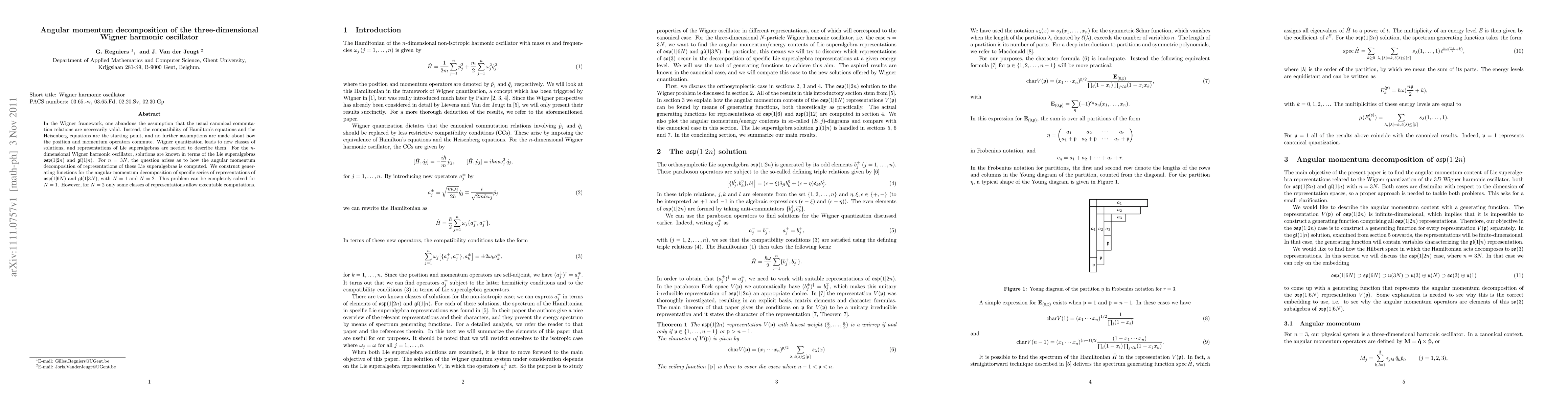This paper explores the angular momentum decomposition of the three-dimensional Wigner harmonic oscillator within the framework of Lie superalgebras, constructing generating functions for specific representations of osp(1|6) and gl(1|3). The problem is fully solvable for N=1 but only partially solvable for N=2.