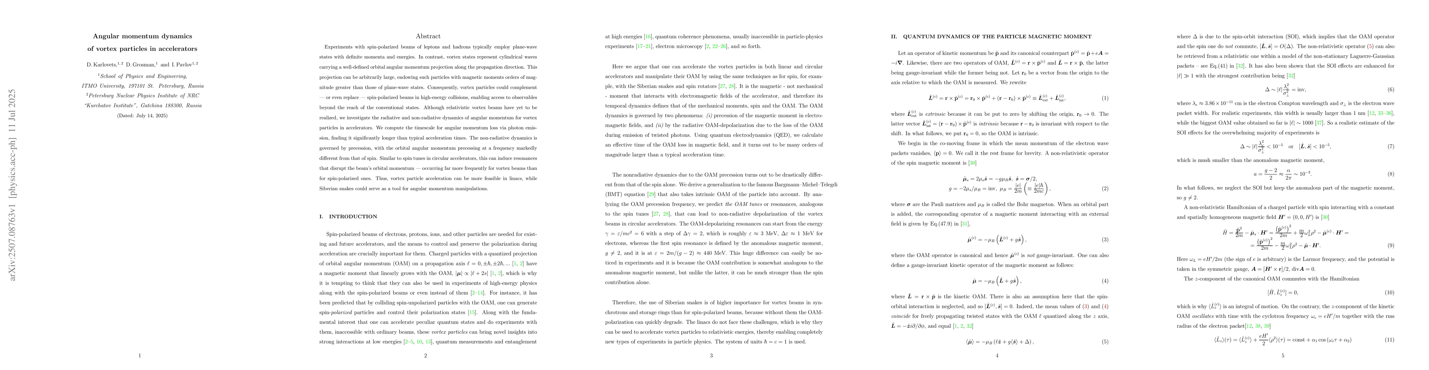 The research explores the potential of vortex particles, which carry large orbital angular momentum, as an alternative to conventional spin-polarized beams in high-energy collisions. It reveals that radiative angular momentum loss in vortex particles is slower than usual acceleration times, and their non-radiative dynamics, governed by precession, can lead to resonances affecting beam orbits more frequently than in spin-polarized beams. The study suggests that linear accelerators (linacs) could more easily accommodate vortex particle acceleration, while Siberian snakes could manipulate their angular momentum.