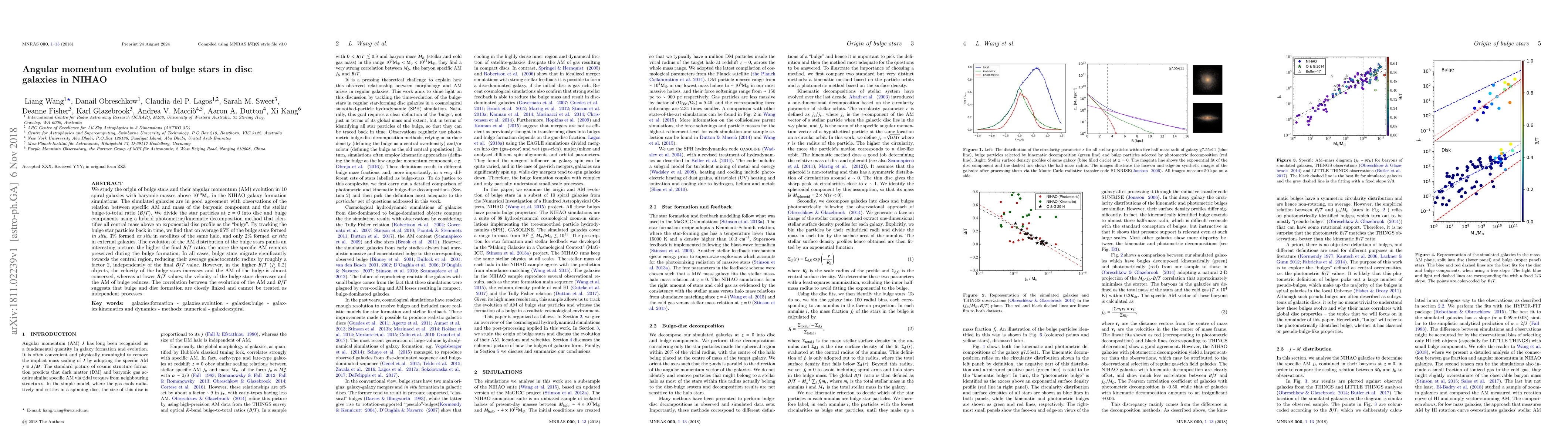 This study investigates the angular momentum evolution of bulge stars in 10 massive spiral galaxies from NIHAO simulations, finding that 95% form in situ while 5% form ex situ. The angular momentum of bulge stars correlates strongly with the bulge-to-total mass ratio, indicating a close link between bulge and disc formation.