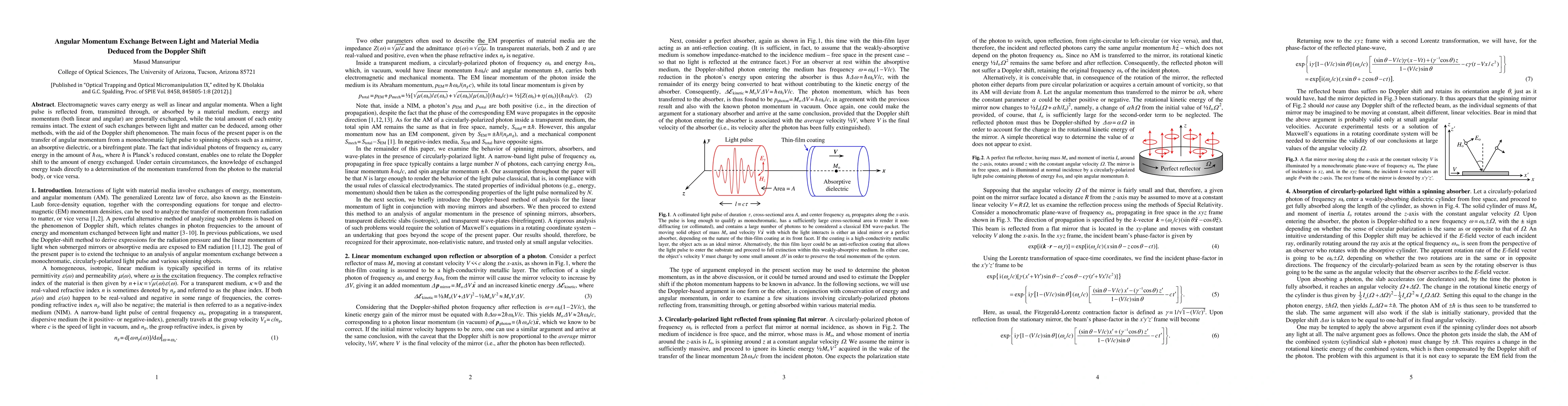 The paper presents a detailed theoretical framework for understanding and calculating the angular momentum exchange between light and rotating material media using Doppler shift and conservation laws.