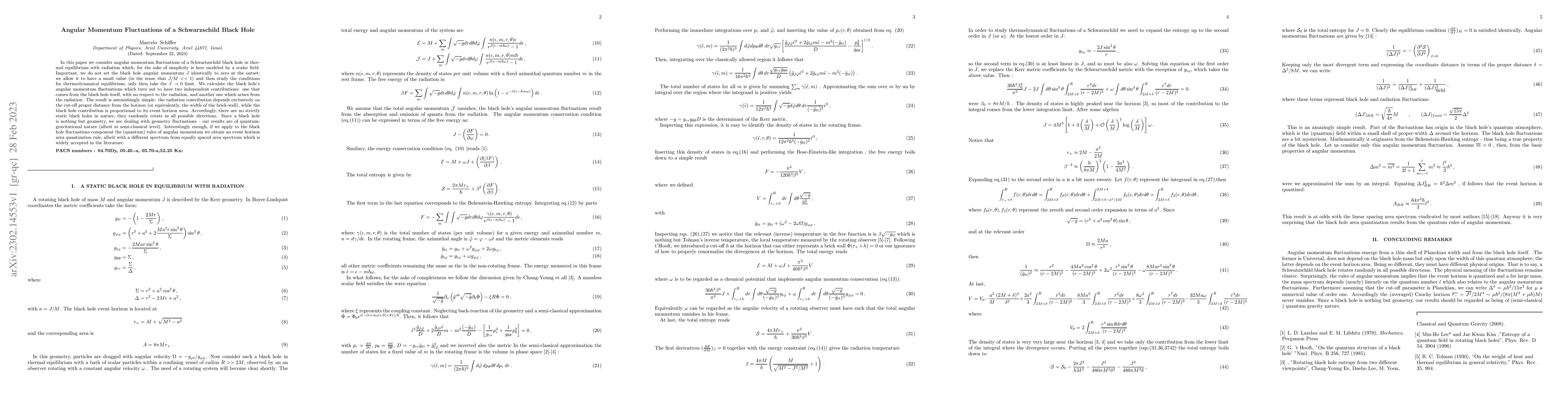 This paper explores angular momentum fluctuations in a Schwarzschild black hole in thermal equilibrium with radiation modeled by a scalar field. It reveals two independent contributions to these fluctuations: one from the black hole itself and another from the radiation, leading to the conclusion that black holes inherently fluctuate and rotate, indicating quantum-gravitational geometry fluctuations and a non-standard event horizon area quantization rule.