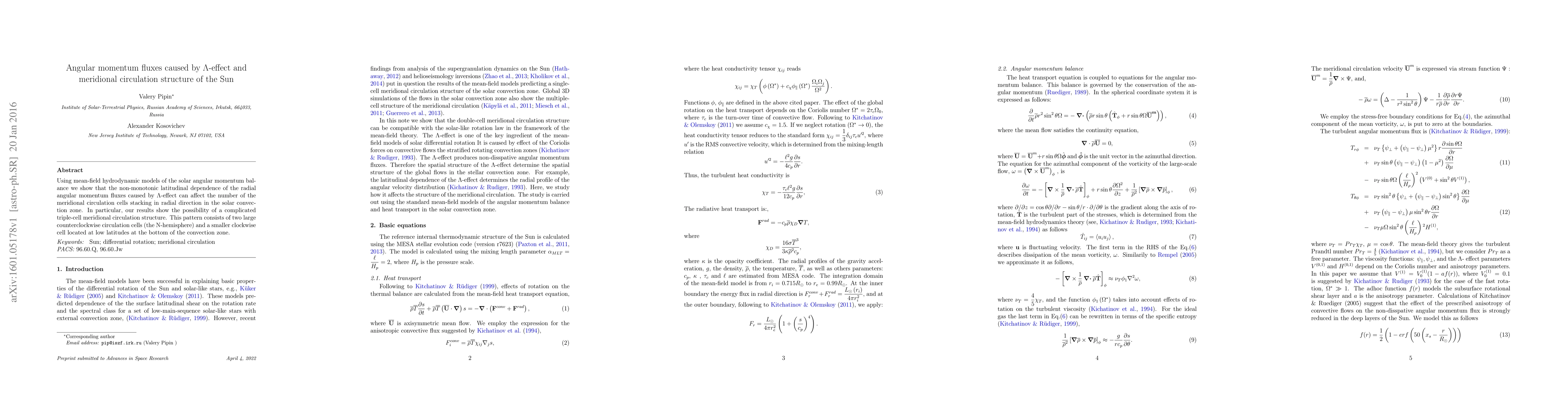 Using mean-field hydrodynamic models of the solar angular momentum balance we show that the non-monotonic latitudinal dependence of the radial angular momentum fluxes caused by Lambda-effect can affect the number of the meridional circulation cells stacking in radial direction in the solar convection zone. In particular, our results show the possibility of a complicated triple-cell meridional circulation structure. This pattern consists of two large counterclockwise circulation cells (the N-hemisphere) and a smaller clockwise cell located at low latitudes at the bottom of the convection zone.