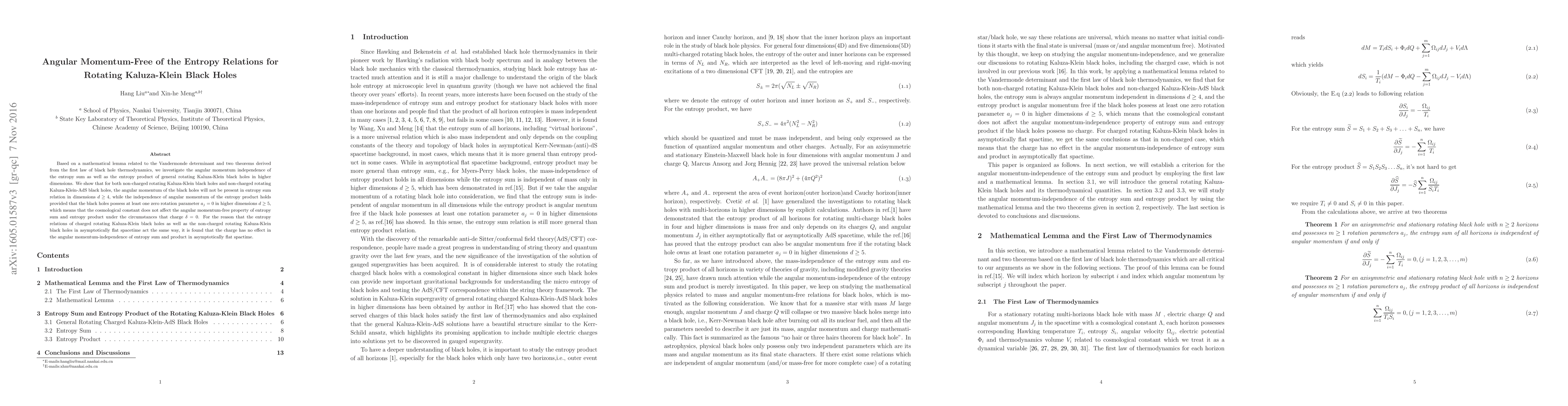 Based on a mathematical lemma related to the Vandermonde determinant and two theorems derived from the first law of black hole thermodynamics, we investigate the angular momentum independence of the entropy sum as well as the entropy product of general rotating Kaluza-Klein black holes in higher dimensions. We show that for both non-charged rotating Kaluza-Klein black holes and non-charged rotating Kaluza-Klein-AdS black holes, the angular momentum of the black holes will not be present in entropy sum relation in dimensions $d\geq4$, while the independence of angular momentum of the entropy product holds provided that the black holes possess at least one zero rotation parameter $a_j$ = 0 in higher dimensions $d\geq5$, which means that the cosmological constant does not affect the angular momentum-free property of entropy sum and entropy product under the circumstances that charge $\delta=0$. For the reason that the entropy relations of charged rotating Kaluza-Klein black holes as well as the non-charged rotating Kaluza-Klein black holes in asymptotically flat spacetime act the same way, it is found that the charge has no effect in the angular momentum-independence of entropy sum and product in asymptotically flat spactime.