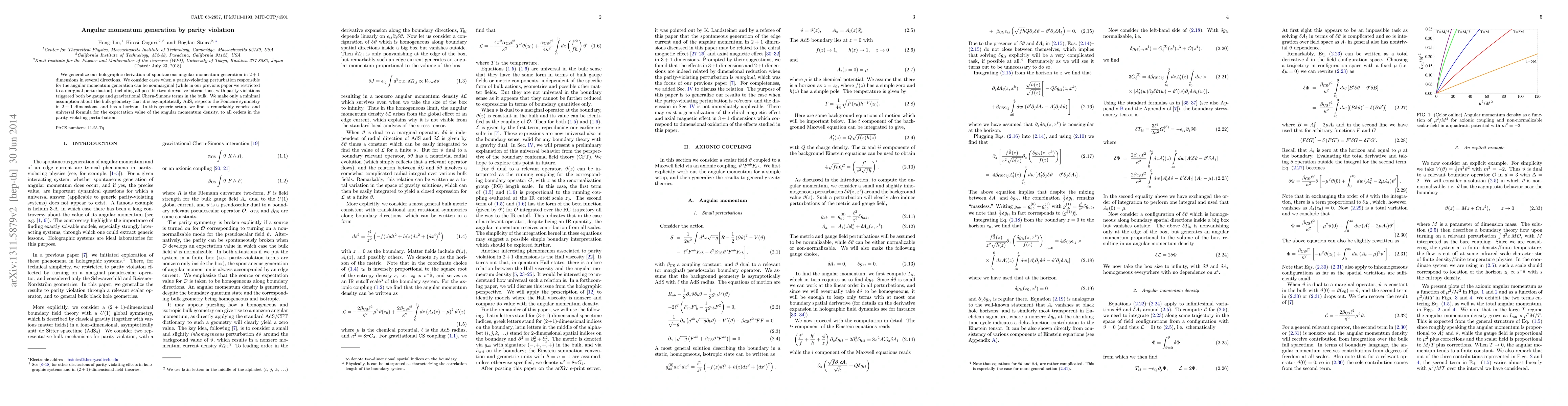 We generalize our holographic derivation of spontaneous angular momentum generation in 2 + 1 dimensions in several directions. We consider cases when a parity violating perturbation responsible for the angular momentum generation can be non-marginal (while in our previous paper we restricted to a marginal perturbation), including all possible two-derivative interactions, with parity violations triggered both by gauge and gravitational Chern-Simons terms in the bulk. We make only a minimal assumption about the bulk geometry that it is asymptotically AdS, respects the Poincar\'e symmetry in 2 + 1 dimensions, and has a horizon. In this generic setup, we find a remarkably concise and universal formula for the expectation value of the angular momentum density, to all orders in the parity violating perturbation.