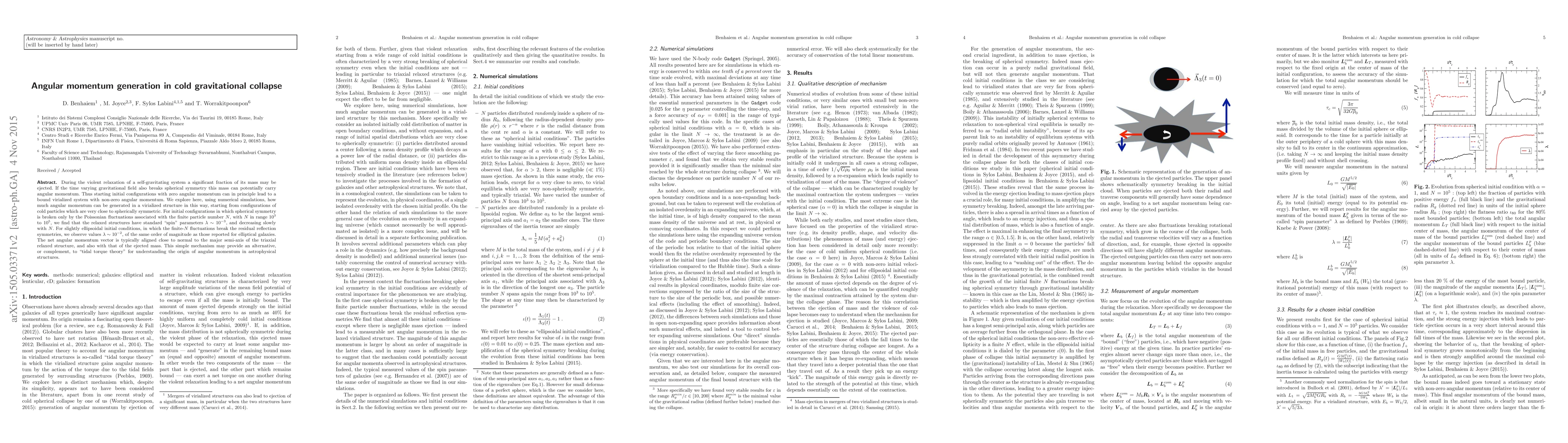 This paper investigates how angular momentum can emerge in cold gravitational collapse through violent relaxation, finding that initial spherically symmetric configurations can generate virialized structures with non-zero angular momentum. Numerical simulations reveal that structures with Poissonian fluctuations develop "spin" parameters around $\lambda \sim 10^{-3}$, while slightly ellipsoidal initial conditions yield $\lambda \sim 10^{-2}$, comparable to elliptical galaxies, suggesting an alternative mechanism for angular momentum generation in astrophysical systems.