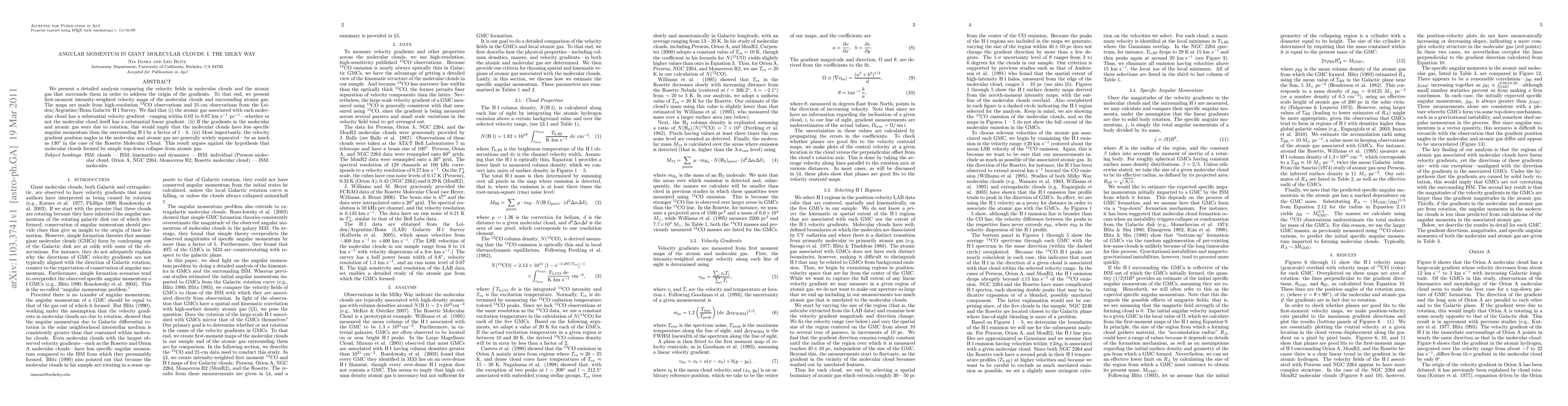 We present a detailed analysis comparing the velocity fields in molecular clouds and the atomic gas that surrounds them in order to address the origin of the gradients. To that end, we present first-moment intensity-weighted velocity maps of the molecular clouds and surrounding atomic gas. The maps are made from high-resolution 13CO observations and 21-cm observations from the Leiden/Argentine/Bonn Galactic HI Survey. We find that (i) the atomic gas associated with each molecular cloud has a substantial velocity gradient---ranging within 0.02 to 0.07 km/s/pc---whether or not the molecular cloud itself has a substantial linear gradient (ii) If the gradients in the molecular and atomic gas were due to rotation, this would imply that the molecular clouds have less specific angular momentum than the surrounding HI by a factor of 1-6. (iii) Most importantly, the velocity gradient position angles in the molecular and atomic gas are generally widely separated---by as much as 130 degrees in the case of the Rosette Molecular Cloud. This result argues against the hypothesis that molecular clouds formed by simple top-down collapse from atomic gas.