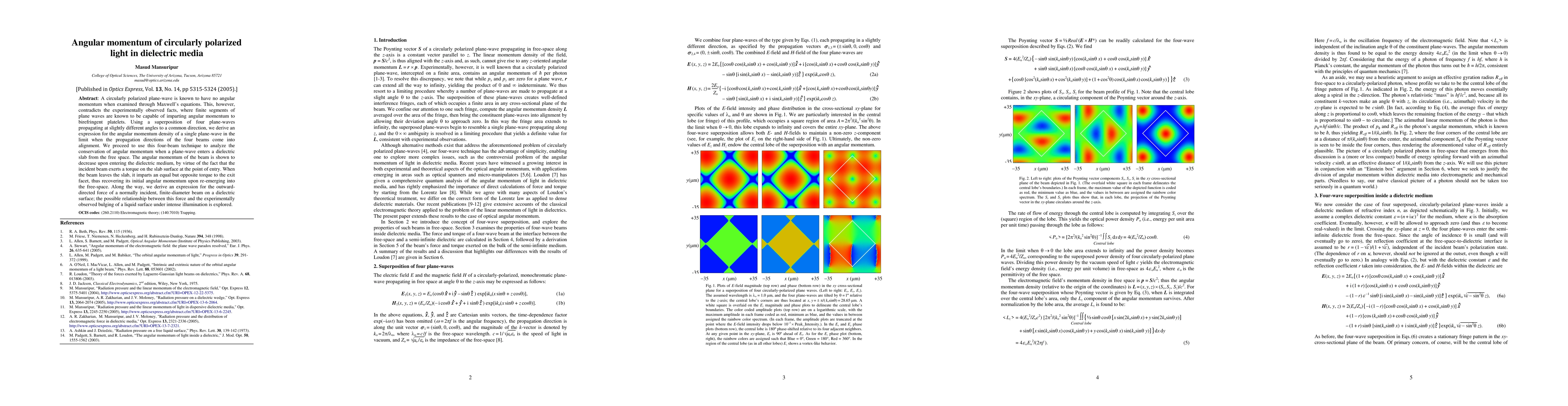 This paper investigates angular momentum in circularly polarized light through dielectric media, revealing that while theoretical models predict no angular momentum, experimental observations show otherwise. The study uses a four-beam technique to demonstrate angular momentum conservation and torque exerted on dielectric surfaces, linking the force on surfaces to phenomena like liquid bulging under intense light.
