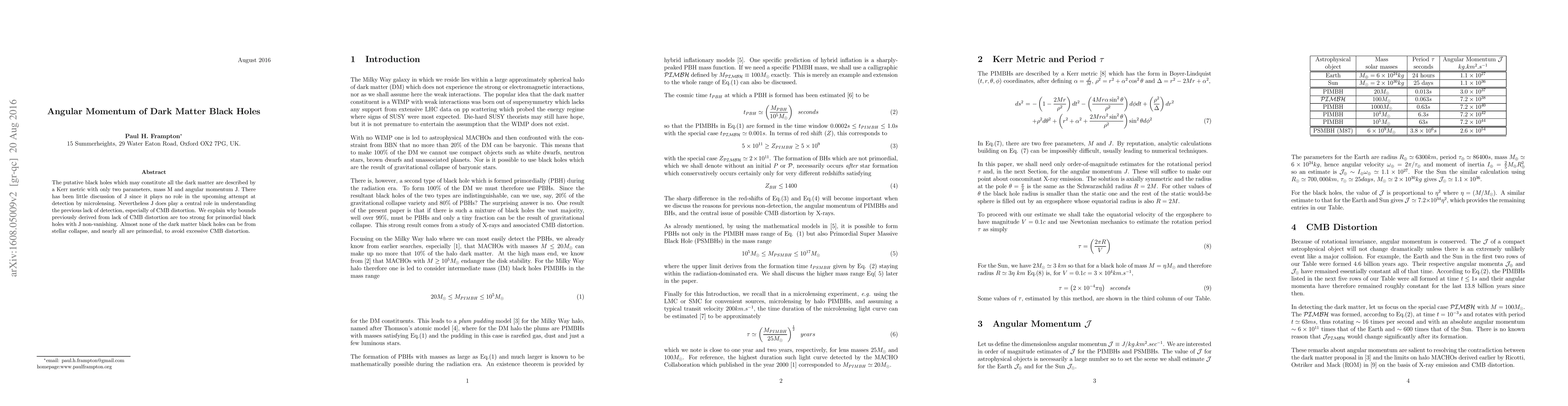 This paper discusses the angular momentum J of dark matter black holes, emphasizing that J is crucial for understanding previous detection failures, especially concerning Cosmic Microwave Background (CMB) distortion. It argues that non-zero J weakens previously derived bounds on primordial black holes, suggesting nearly all dark matter black holes are primordial to avoid excessive CMB distortion.