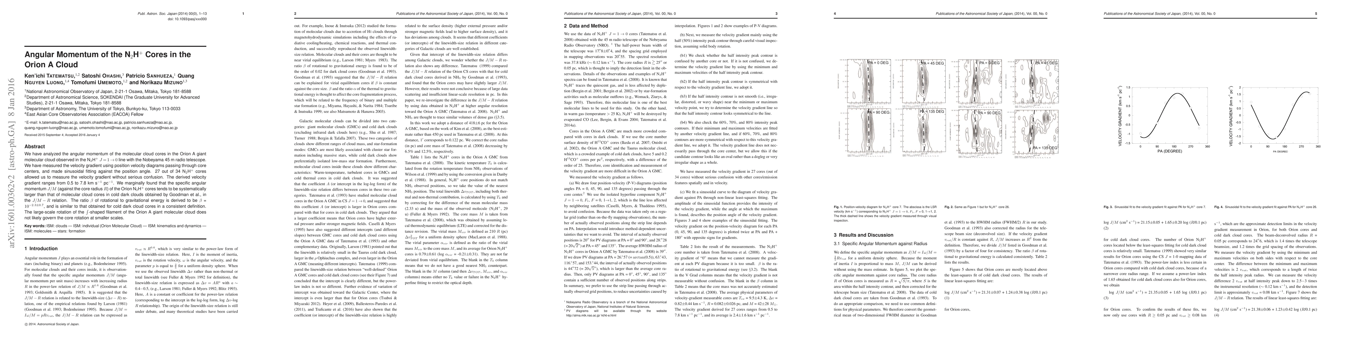 This study measures the angular momentum of N2H+ cores in the Orion A cloud using the N2H+ J = 1-0 line, finding that the specific angular momentum of these cores is higher than that of cold dark cloud cores. The derived ratio of rotational to gravitational energy suggests that core rotation is not significantly influenced by the large-scale rotation of the Orion A filament.