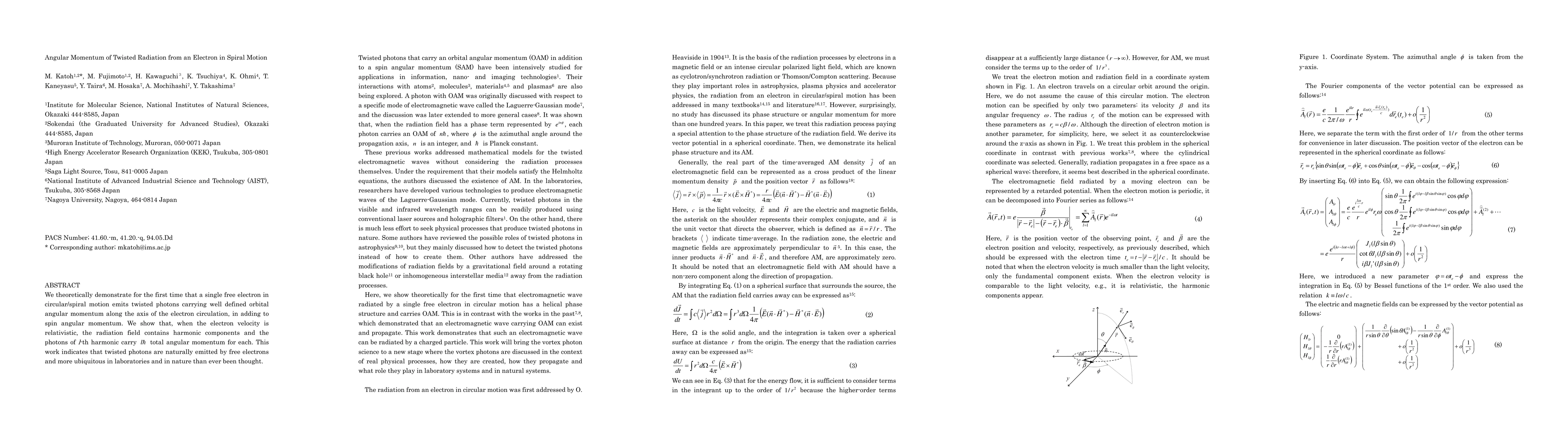 We theoretically demonstrate for the first time that a single free electron in circular/spiral motion emits twisted photons carrying well defined orbital angular momentum along the axis of the electron circulation, in adding to spin angular momentum. We show that, when the electron velocity is relativistic, the radiation field contains harmonic components and the photons of l-th harmonic carry lhbar total angular momentum for each. This work indicates that twisted photons are naturally emitted by free electrons and more ubiquitous in laboratories and in nature than ever been thought.